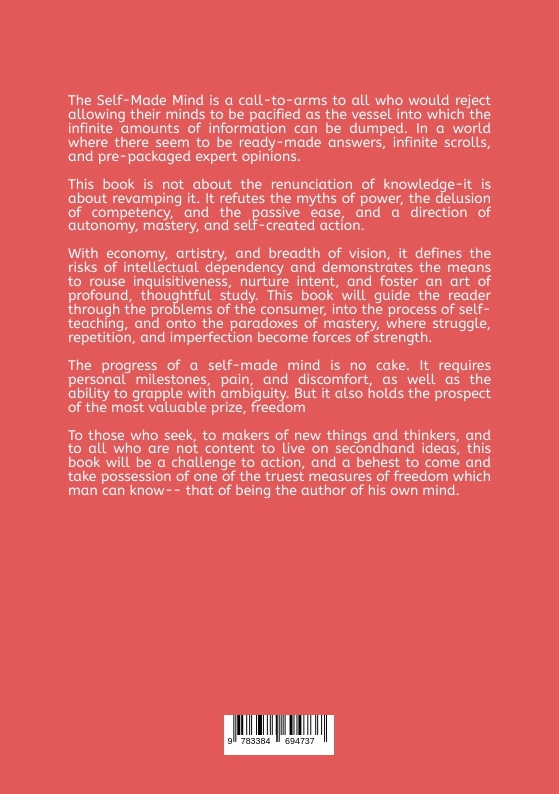 The Self-Made Mind is a call-to-arms to all who would reject allowing their minds to be pacified as the vessel into which the infinite amounts of information can be dumped. In a world where there seem to be ready-made answers, infinite scrolls, and pre-packaged expert opinions.This book is not about the renunciation of knowledge-it is about revamping it. It refutes the myths of power, the delusion of competency, and the passive ease, and a direction of autonomy, mastery, and self-created action.With economy, artistry, and breadth of vision, it defines the risks of intellectual dependency and demonstrates the means to rouse inquisitiveness, nurture intent, and foster an art of profound, thoughtful study. This book will guide the reader through the problems of the consumer, into the process of self-teaching, and onto the paradoxes of mastery, where struggle, repetition, and imperfection become forces of strength.The progress of a self-made mind is no cake. It requires personal milestones, pain, and discomfort, as well as the ability to grapple with ambiguity. But it also holds the prospect of the most valuable prize, freedomTo those who seek, to makers of new things and thinkers, and to all who are not content to live on secondhand ideas, this book will be a challenge to action, and a behest to come and take possession of one of the truest measures of freedom which man can know-- that of being the author of his own mind.