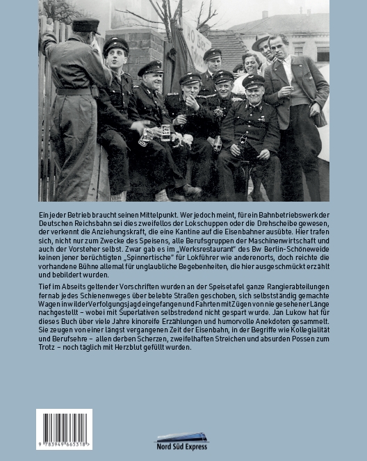 Ein jeder Betrieb braucht seinen Mittelpunkt. Wer jedoch meint, für ein Bahnbetriebswerk der Deutschen Reichsbahn sei dies zweifellos der Lokschuppen oder die Drehscheibe gewesen, der verkennt die Anziehungskraft, die eine Kantine auf die Eisenbahner ausübte. Hier trafen sich, nicht nur zum Zwecke des Speisens, alle Berufsgruppen der Maschinenwirtschaft und auch der Vorsteher selbst. Zwar gab es im „Werksrestaurant“ des Bw Berlin-Schöneweide keinen jener berüchtigten „Spinnertische“ für Lokführer wie anderenorts, doch reichte die vorhandene Bühne allemal für unglaubliche Begebenheiten, die hier ausgeschmückt erzählt und bebildert wurden.