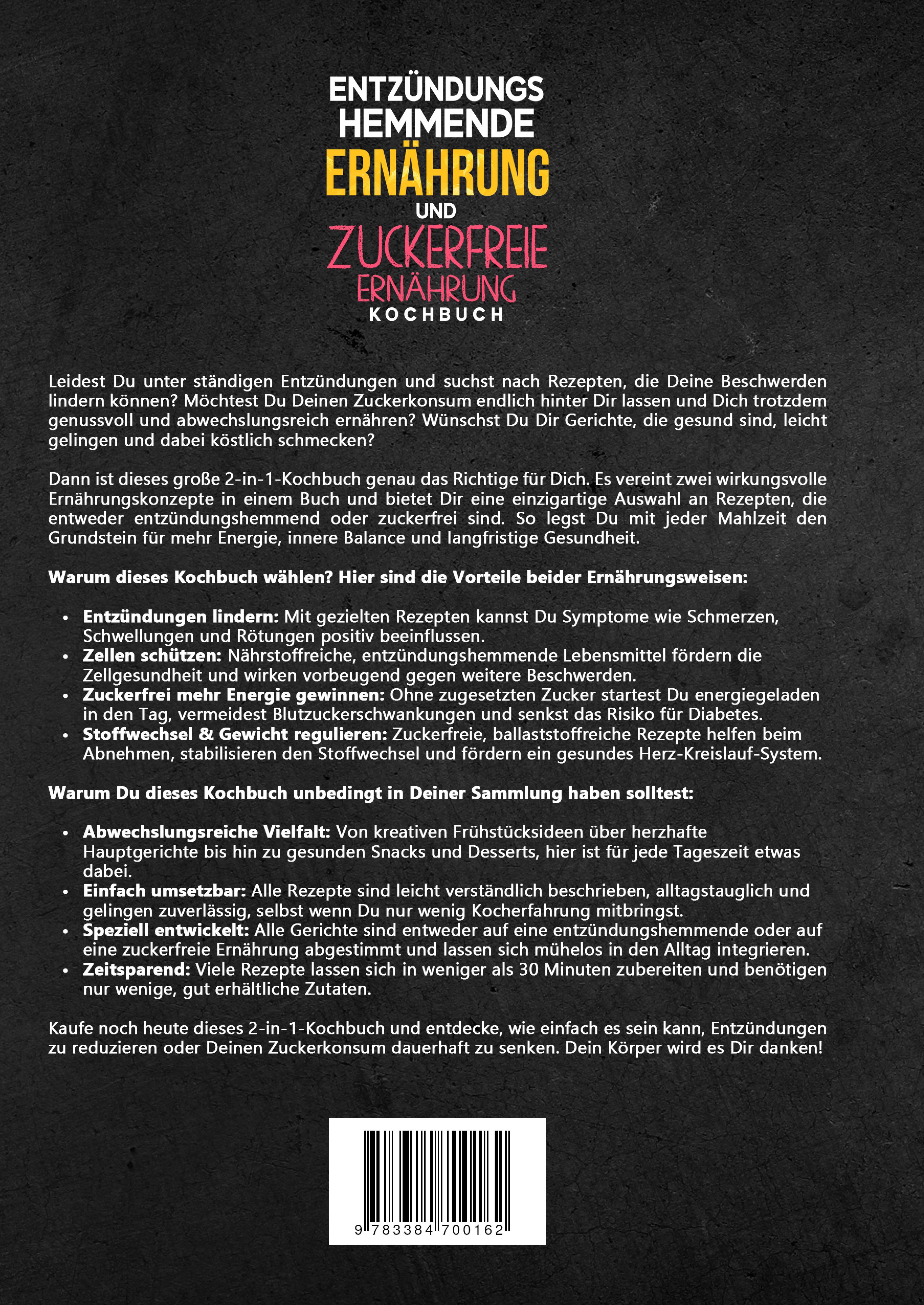 Leidest Du unter ständigen Entzündungen und suchst nach Rezepten, die Deine Beschwerden lindern können? Möchtest Du Deinen Zuckerkonsum endlich hinter Dir lassen und Dich trotzdem genussvoll und abwechslungsreich ernähren? Wünschst Du Dir Gerichte, die gesund sind, leicht gelingen und dabei köstlich schmecken?Dann ist dieses große 2-in-1-Kochbuch genau das Richtige für Dich. Es vereint zwei wirkungsvolle Ernährungskonzepte in einem Buch und bietet Dir eine einzigartige Auswahl an Rezepten, die entweder entzündungshemmend oder zuckerfrei sind. So legst Du mit jeder Mahlzeit den Grundstein für mehr Energie, innere Balance und langfristige Gesundheit.Warum dieses Kochbuch wählen? Hier sind die Vorteile beider Ernährungsweisen:- Entzündungen lindern: Mit gezielten Rezepten kannst Du Symptome wie Schmerzen, Schwellungen und Rötungen positiv beeinflussen.- Zellen schützen: Nährstoffreiche, entzündungshemmende Lebensmittel fördern die Zellgesundheit und wirken vorbeugend gegen weitere Beschwerden.- Zuckerfrei mehr Energie gewinnen: Ohne zugesetzten Zucker startest Du energiegeladen in den Tag, vermeidest Blutzuckerschwankungen und senkst das Risiko für Diabetes.- Stoffwechsel & Gewicht regulieren: Zuckerfreie, ballaststoffreiche Rezepte helfen beim Abnehmen, stabilisieren den Stoffwechsel und fördern ein gesundes Herz-Kreislauf-System.Warum Du dieses Kochbuch unbedingt in Deiner Sammlung haben solltest:- Abwechslungsreiche Vielfalt: Von kreativen Frühstücksideen über herzhafte Hauptgerichte bis hin zu gesunden Snacks und Desserts, hier ist für jede Tageszeit etwas dabei.- Einfach umsetzbar: Alle Rezepte sind leicht verständlich beschrieben, alltagstauglich und gelingen zuverlässig, selbst wenn Du nur wenig Kocherfahrung mitbringst.- Speziell entwickelt: Alle Gerichte sind entweder auf eine entzündungshemmende oder auf eine zuckerfreie Ernährung abgestimmt und lassen sich mühelos in den Alltag integrieren.- Zeitsparend: Viele Rezepte lassen sich in weniger als 30 Minuten zubereiten und benötigen nur wenige, gut erhältliche Zutaten.Kaufe noch heute dieses 2-in-1-Kochbuch und entdecke, wie einfach es sein kann, Entzündungen zu reduzieren oder Deinen Zuckerkonsum dauerhaft zu senken. Dein Körper wird es Dir danken!