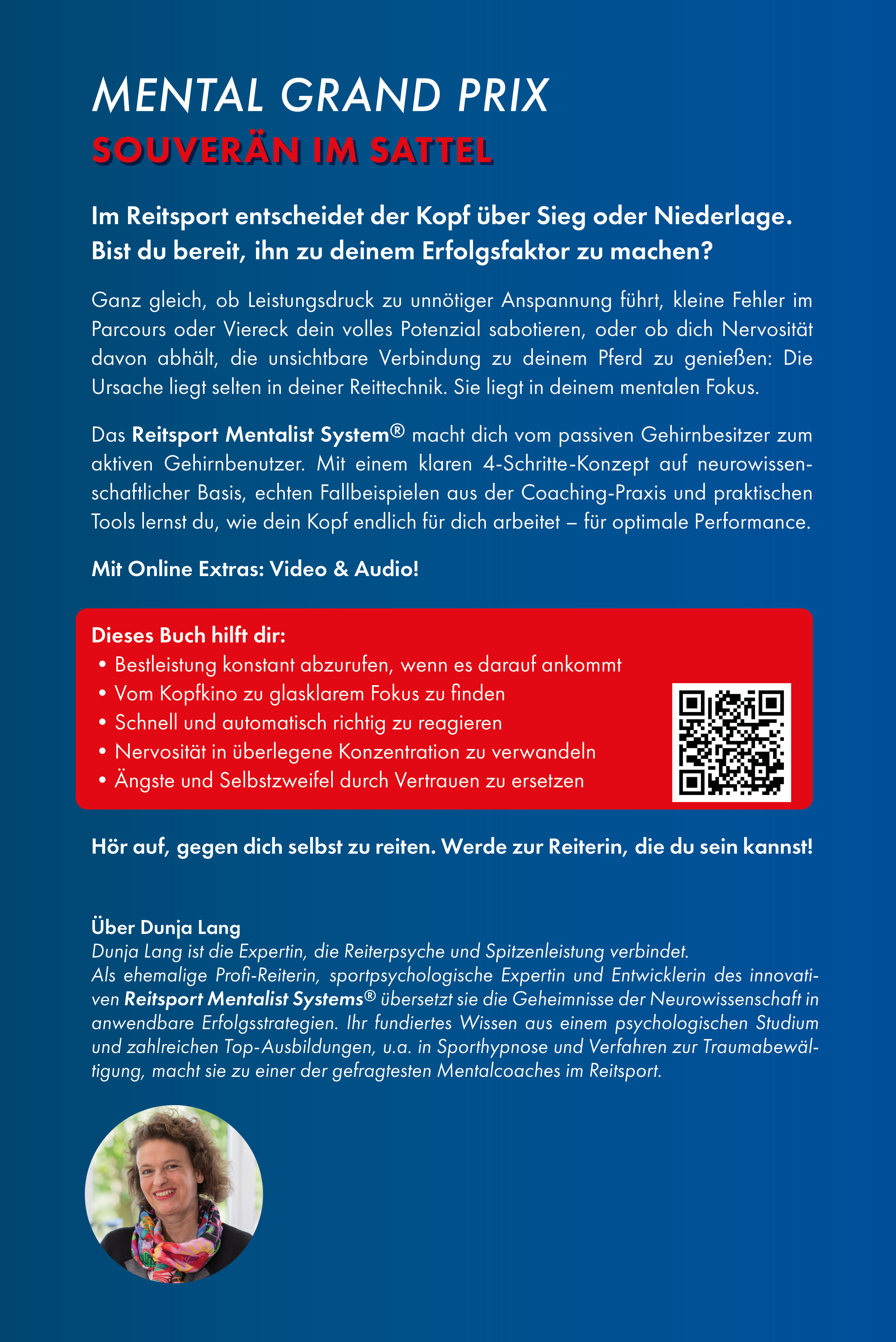 Als ehemalige Profi-Reiterin, sportpsychologische Expertin und Entwicklerin des innovativen Reitsport Mentalist Systems® zeigt Dunja Lang dir die Abkürzung zu mehr Souveränität im Sattel.