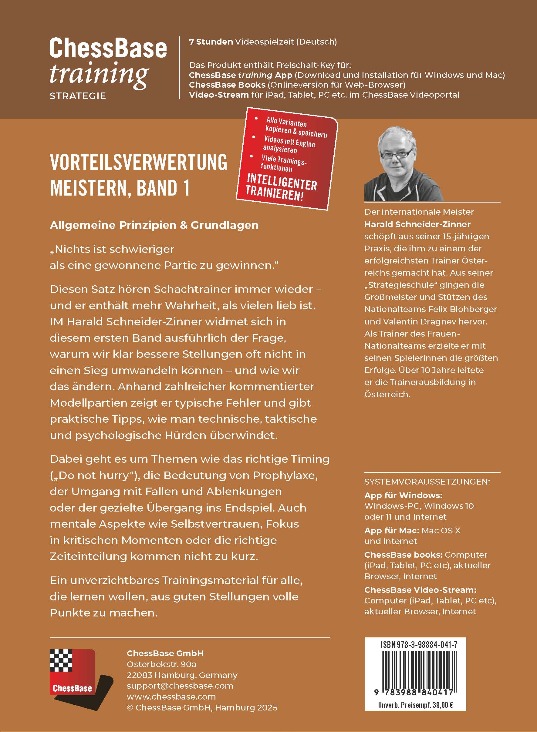 "Nichts ist schwieriger als eine gewonnene Partie zu gewinnen."Diesen Satz hören Schachtrainer immer wieder - und er enthält mehr Wahrheit, als vielen lieb ist. IM Harald Schneider-Zinner widmet sich in diesem ersten Band ausführlich der Frage, warum wir klar bessere Stellungen oft nicht in einen Sieg umwandeln können - und wie wir das ändern. Anhand zahlreicher kommentierter Modellpartien zeigt er typische Fehler und gibt praktische Tipps, wie man technische, taktische und psychologische Hürden überwindet.Dabei geht es um Themen wie das richtige Timing ("Do not hurry"), die Bedeutung von Prophylaxe, der Umgang mit Fallen und Ablenkungen oder der gezielte Übergang ins Endspiel. Auch mentale Aspekte wie Selbstvertrauen, Fokus in kritischen Momenten oder die richtige Zeiteinteilung kommen nicht zu kurz.Ein unverzichtbares Trainingsmaterial für alle, die lernen wollen, aus guten Stellungen volle Punkte zu machen.7 Stunden Videospielzeit (Deutsch)Das Produkt enthält Freischalt-Key für:ChessBase training App (Download und Installation für Windows und Mac)ChessBase Books (Onlineversion für Web-Browser)Video-Stream für iPad, Tablet, PC etc. im ChessBase VideoportalINTELLIGENTER TRAINIEREN!- Alle Varianten kopieren & speichern- Videos mit Engine analysieren- Viele TrainingsfunktionenSYSTEMVORAUSSETZUNGEN:App für Windows: Windows-PC, Windows 10 oder 11 und InternetApp für Mac: Mac OS X und InternetChessBase books: Computer (iPad, Tablet, PC etc), aktueller Browser, InternetChessBase Video-Stream: Computer (iPad, Tablet, PC etc), aktueller Browser, Internet