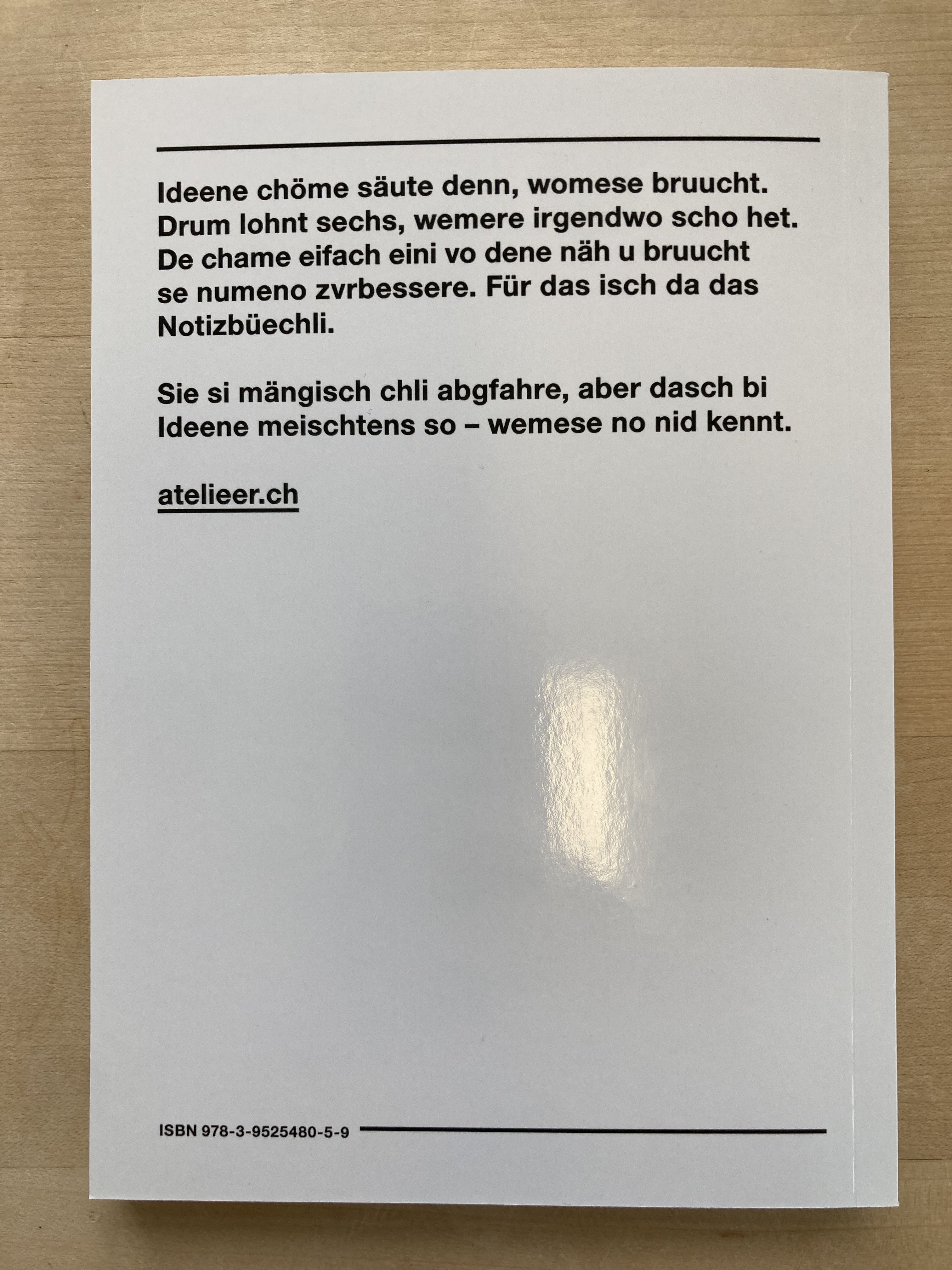 Ideen Chöre säute denn, womese bruucht. Drum lohnt sechs, wemere irgendwo scho het. De chame eifach eine vo dene näh u braucht se numeno zvrbessere. Für das isch da das Notizbüechli.