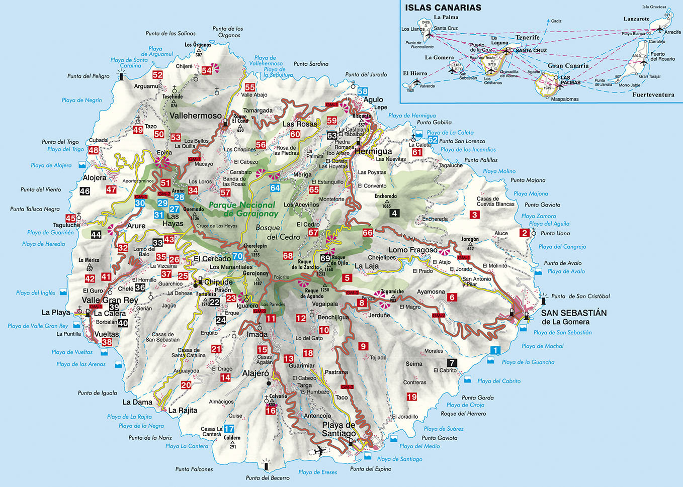 La Gomera parece estar hecha para el caminante y amante de la naturaleza, y ofrece un paisaje de increíble diversidad: valles idílicos con terrazas de cultivo y bosques de palmeras contrastan con los ásperos acantilados y las espectaculares gargantas, la laurisilva encantada del Parque Nacional del Garajonay con pinares y plantaciones de plátanos. Aguarda al senderista un disfrute sin igual, entre playas de lava deslumbrantes, selva nublada exuberante y crestas sumergidas en el mar de nubes.