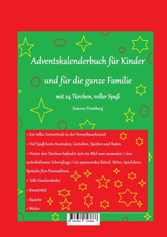 Adventskalenderbuch für Kinder und für die ganze Familiemit 24 Türchen, voller SpaßVon Simone Homberg + Ein toller Zeitvertreib in der Vorweihnachtszeit+ Viel Spaß beim Ausmalen, Gestalten, Spielen und Raten.+ Hinter den Türchen befindet sich ein Bild zum ausmalen / eine unterhaltsame Scherzfrage / ein spannendes Rätsel, Witze, Spielideen, Sprüche fürs Poesiealbum.+ Tolle Geschenkidee+ Kreativität+ Basteln+ Malen