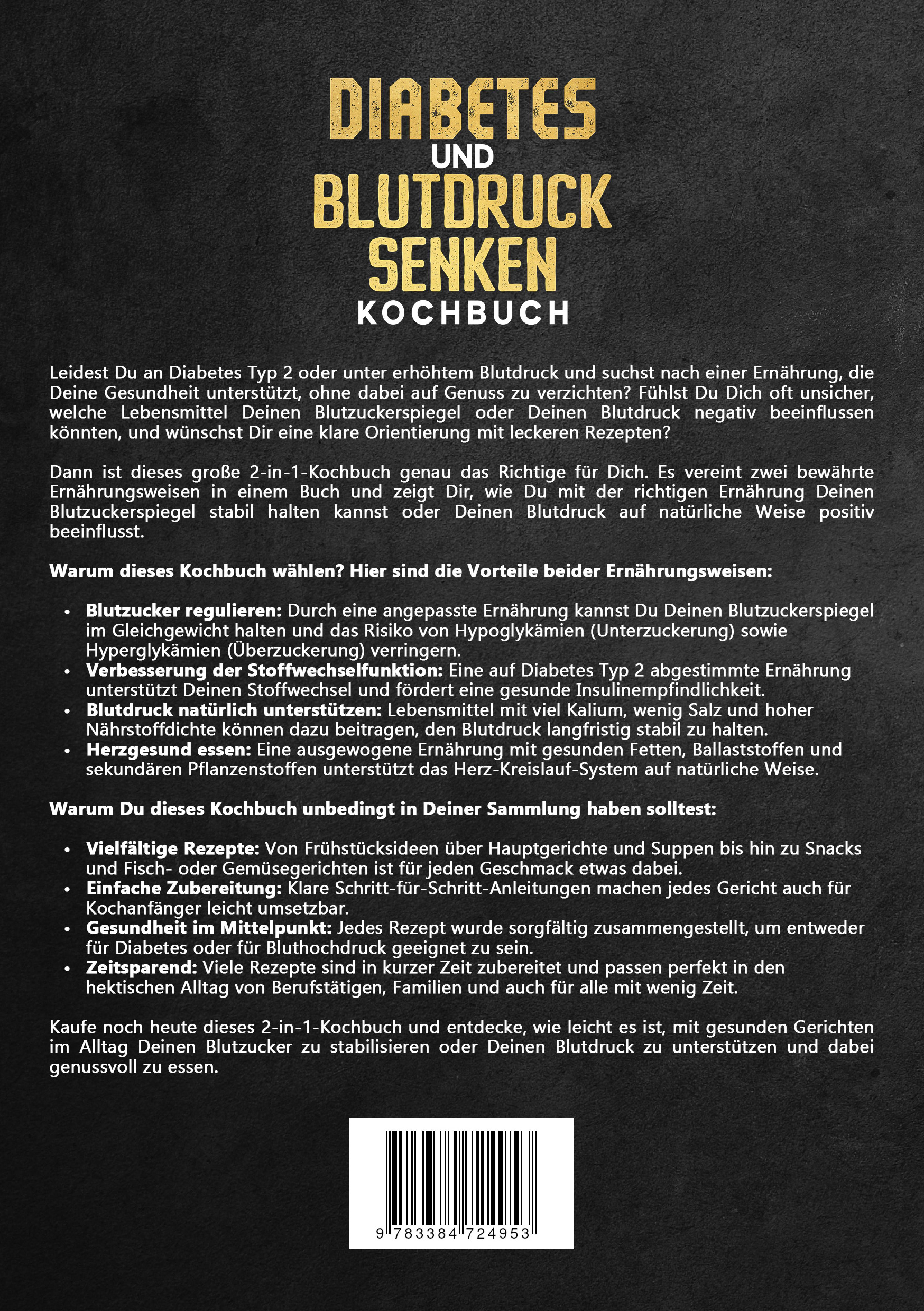 Leidest Du an Diabetes Typ 2 oder unter erhöhtem Blutdruck und suchst nach einer Ernährung, die Deine Gesundheit unterstützt, ohne dabei auf Genuss zu verzichten? Fühlst Du Dich oft unsicher, welche Lebensmittel Deinen Blutzuckerspiegel oder Deinen Blutdruck negativ beeinflussen könnten, und wünschst Dir eine klare Orientierung mit leckeren Rezepten?Dann ist dieses große 2-in-1-Kochbuch genau das Richtige für Dich. Es vereint zwei bewährte Ernährungsweisen in einem Buch und zeigt Dir, wie Du mit der richtigen Ernährung Deinen Blutzuckerspiegel stabil halten kannst oder Deinen Blutdruck auf natürliche Weise positiv beeinflusst.Warum dieses Kochbuch wählen? Hier sind die Vorteile beider Ernährungsweisen:- Blutzucker regulieren: Durch eine angepasste Ernährung kannst Du Deinen Blutzuckerspiegel im Gleichgewicht halten und das Risiko von Hypoglykämien (Unterzuckerung) sowie Hyperglykämien (Überzuckerung) verringern.- Verbesserung der Stoffwechselfunktion: Eine auf Diabetes Typ 2 abgestimmte Ernährung unterstützt Deinen Stoffwechsel und fördert eine gesunde Insulinempfindlichkeit.- Blutdruck natürlich unterstützen: Lebensmittel mit viel Kalium, wenig Salz und hoher Nährstoffdichte können dazu beitragen, den Blutdruck langfristig stabil zu halten.- Herzgesund essen: Eine ausgewogene Ernährung mit gesunden Fetten, Ballaststoffen und sekundären Pflanzenstoffen unterstützt das Herz-Kreislauf-System auf natürliche Weise.Warum Du dieses Kochbuch unbedingt in Deiner Sammlung haben solltest:- Vielfältige Rezepte: Von Frühstücksideen über Hauptgerichte und Suppen bis hin zu Snacks und Fisch- oder Gemüsegerichten ist für jeden Geschmack etwas dabei.- Einfache Zubereitung: Klare Schritt-für-Schritt-Anleitungen machen jedes Gericht auch für Kochanfänger leicht umsetzbar.- Gesundheit im Mittelpunkt: Jedes Rezept wurde sorgfältig zusammengestellt, um entweder für Diabetes oder für Bluthochdruck geeignet zu sein.- Zeitsparend: Viele Rezepte sind in kurzer Zeit zubereitet und passen perfekt in den hektischen Alltag von Berufstätigen, Familien und auch für alle mit wenig Zeit.Kaufe noch heute dieses 2-in-1-Kochbuch und entdecke, wie leicht es ist, mit gesunden Gerichten im Alltag Deinen Blutzucker zu stabilisieren oder Deinen Blutdruck zu unterstützen und dabei genussvoll zu essen.