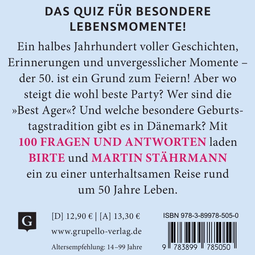 Ein halbes Jahrhundert voller Geschichten, Erinnerungen und unvergesslicher Momente - der 50. ist ein Grund zum Feiern! So viel hat man schon erreicht, noch mehr liegt vor einem. Birte und Martin Stährmann gehen in 100 Fragen und Antworten auf eine spannende Zeitreise rund um den runden Geburtstag. Wo feiert man die wohl beste Party zum 50.? Welche besondere Tradition gibt es in Dänemark? Das perfekte Geschenk zum runden Geburtstag!Stilvoll, elegant und immer eine gute Idee: Die Reihe "Quiz im Quadrat" präsentiert sich in modernem Design und sorgt für unterhaltsamen Rätselspaß - verpackt in einer edlen Geschenkbox. Perfekt als besondere 'Grußkarte' mit Mehrwert - zum Verschenken oder Selberfreuen!