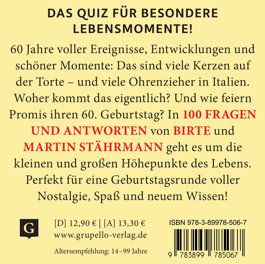 | Schlagworte | Geburtstagsgeschenk • Geburtstagsquiz • Jubiläums-Quiz • Nostalgie • Party-Quiz • Quizbox • Quiz zum 60. Geburtstag • Ratespiel • Rätsel • Themen-Quiz |