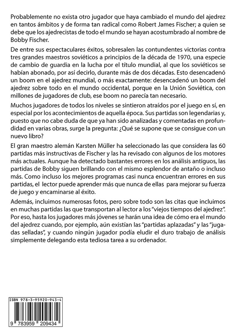 El gran maestro alemán Karsten Müller ha seleccionado las que considera las 60 partidas más instructivas de Fischer y las ha revisado con algunos de los motores más actuales. Aunque ha detectado bastantes errores en los análisis antiguos, las partidas de Bobby siguen brillando con el mismo esplendor de antaño o incluso más. Como incluso los mejores programas casi nunca encuentran errores en sus partidas, el lector puede aprender más que nunca de ellas para mejorar su fuerza de juego y encaminarse al éxito.
