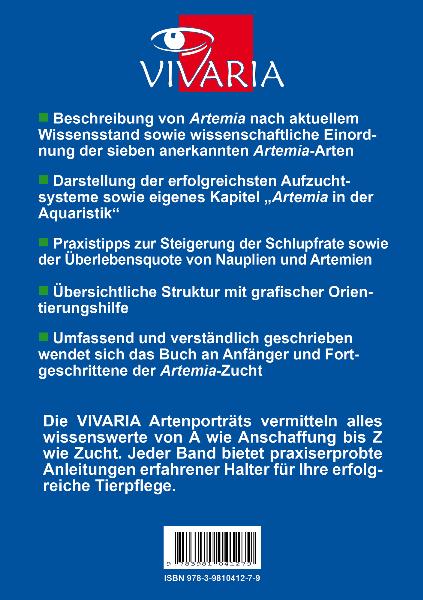 SYSTEMATIK 7VERBREITUNG UND LEBENSRAUM 10VERHALTEN 12LEBENSZYKLUS 15 Beschreibung 15Geschlechtsunterscheidung 17Fortpflanzung 19Schlupf 23Entwicklung und Fütterung der Nauplien 25AUFZUCHTSYSTEME 27Die Einmachglasmethode 27Die Aufzuchtschale 28Das Kulturgerät 29Aquabreed 200 / 1000 31Der Nauplistar 32Der Inkubator 33HÄLTERUNGSSYSTEME 36Indoor-Hälterung 36Outdoor-Hälterung 38ARTEMIA IN DER AQUARISTIK 40Artemia als Fischfutter 40Handel mit Artemia-Eiern 45Artemia en gros 48PROBLEME BEI DER AUFZUCHT 51Frühsterblichkeit 51Hygiene 52HILFREICHE ADRESSEN 55GLOSSAR 56LITERATURVERZEICHNIS 58STICHWORTVERZEICHNIS 60BILDQUELLENNACHWEIS 63