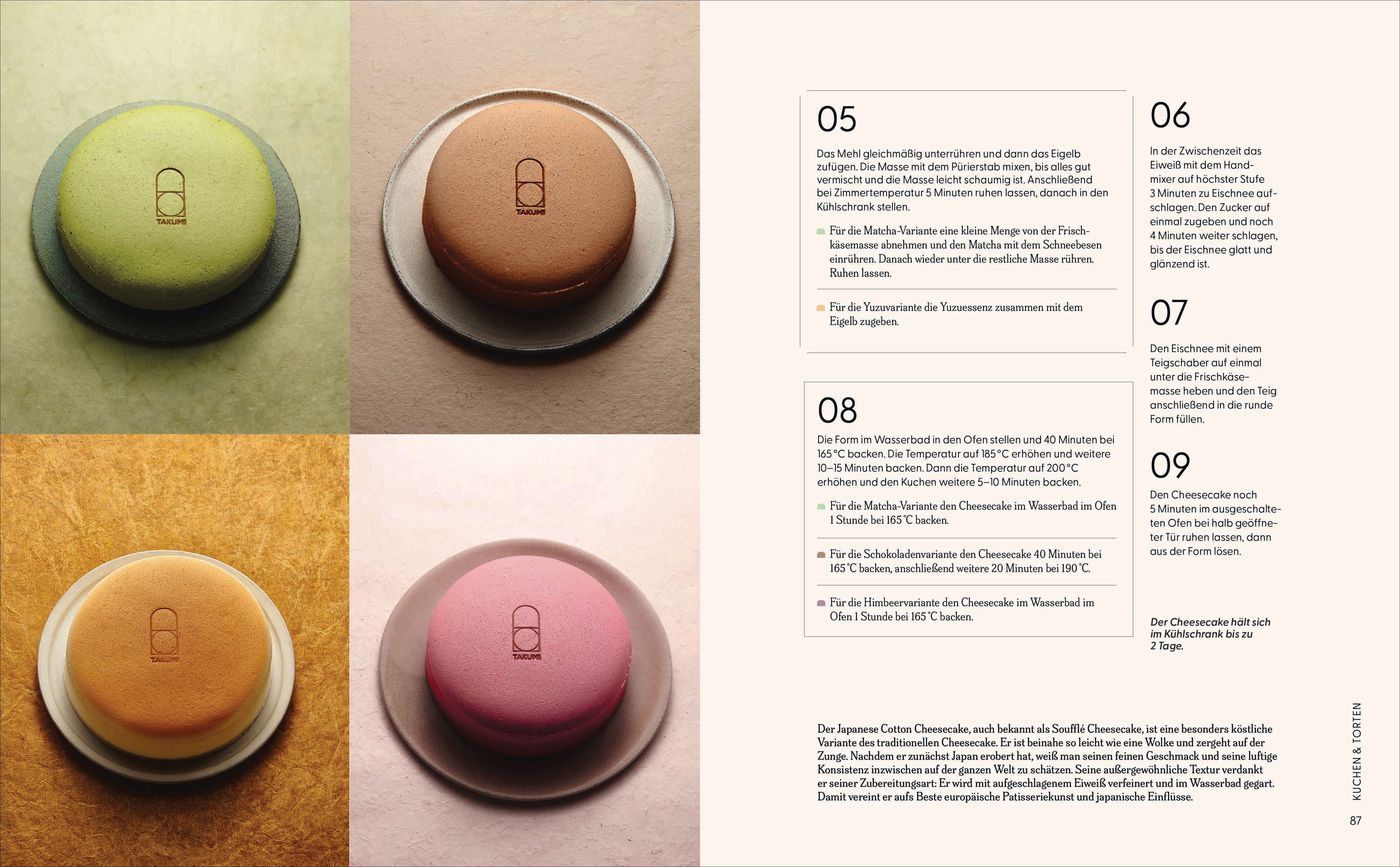 TAKUMI ist der erste Hersteller von authentischen japanischen Cheesecake in Paris. In Japan steht der Begriff Takumi für Handwerker mit außergewöhnlichen Fertigkeiten, bezeichnet also echte Meister ihres Fachs. Oft haben diese über 60.000 Stunden damit verbracht, ihr Handwerk zu perfektionieren und so den Gipfel ihres Könnens zu erreichen. Takumi Paris hat sich zum Ziel gesetzt, täglich exzellente, präzise und bis ins kleinste Detail ausgearbeitete Produkte aus den besten Rohstoffen anzubieten. In diesem wunderschönen und edlen Backbuch finden sich Japanisches Toastbrot, Brioche, Sando, Käsekuchen, Cheesecake, Cheese Tarts, Cream Puffs ... Insgesamt enthält es 80 Rezepte, welche die Raffinesse japanischer Kreationen mit außergewöhnlichen Produkten (Yuzu, Vanille, Matcha, schwarzer Sesam ...) zu einer großen Palette an Geschmacksrichtungen verbinden.