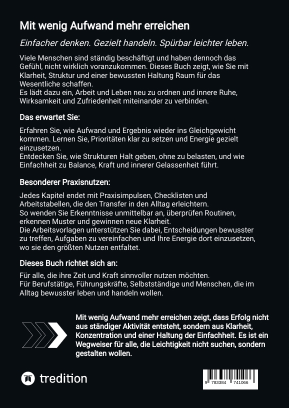 | Schlagworte | Achtsamkeit • Balance • Einfachheit • Fokus • Klarheit • Leichtigkeit • Selbstführung • Selbstfürsorge • Struktur • Wirksamkeit |