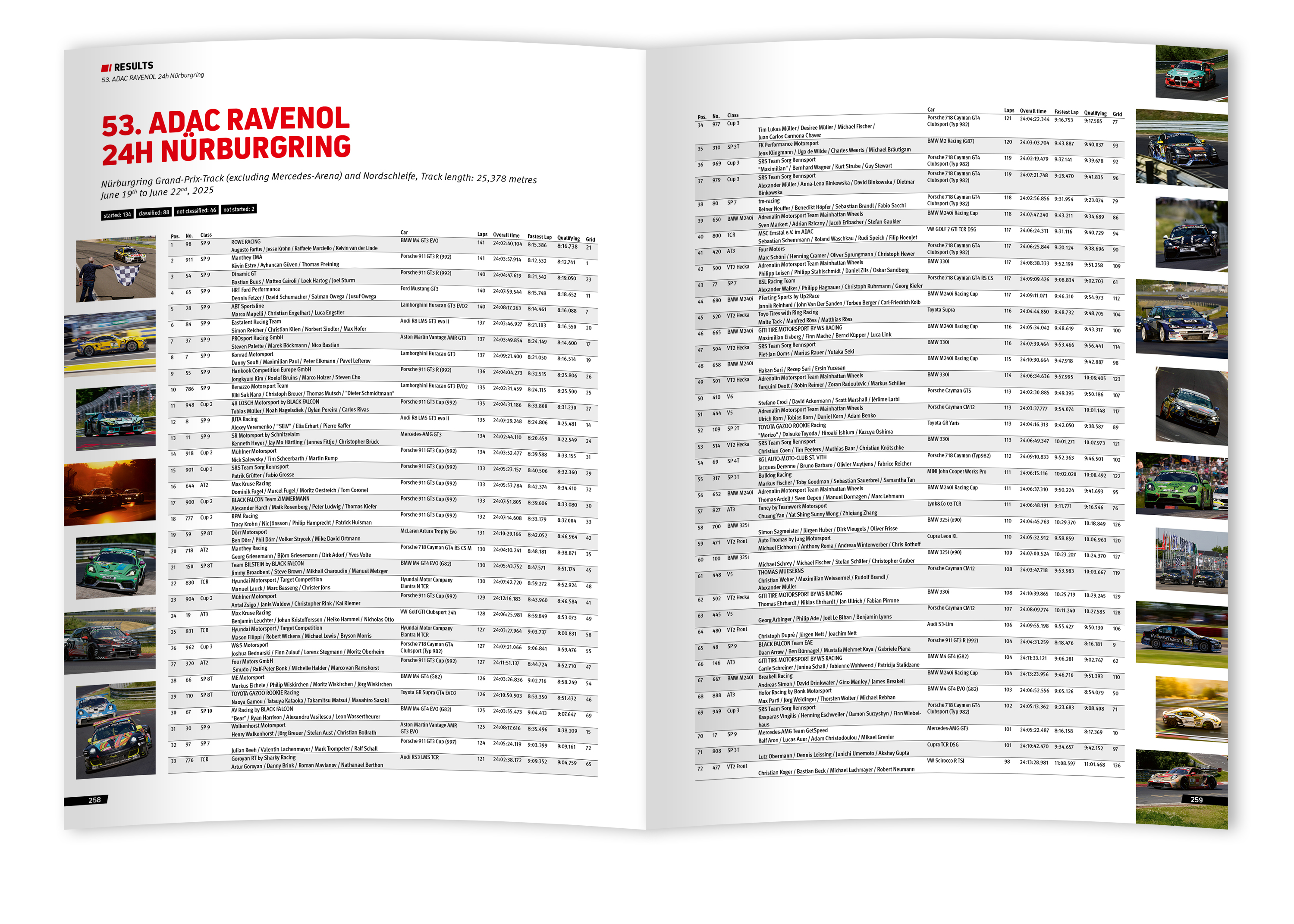 Auch dieser ebenso dramatische wie heiß diskutierte Ausgang des Rennens ist im offiziellen 24h-Jahrbuch nachzulesen – und viele, viele weitere Facetten dieses fantastischen Rennens werden hier noch einmal zum Leben erweckt. Dafür sorgen nicht zuletzt die Bilder, die jedes einzelne der über 130 gestarteten Fahrzeuge zeigen. Alle Infos zum Geschehen in den Klassen, zum Rahmenprogramm sowie ein ausführlicher Statistikteil machen dieses Buch zum perfekten Nachschlagewerk, das in keinem Regal eines echten 24h-Fans fehlen sollte.