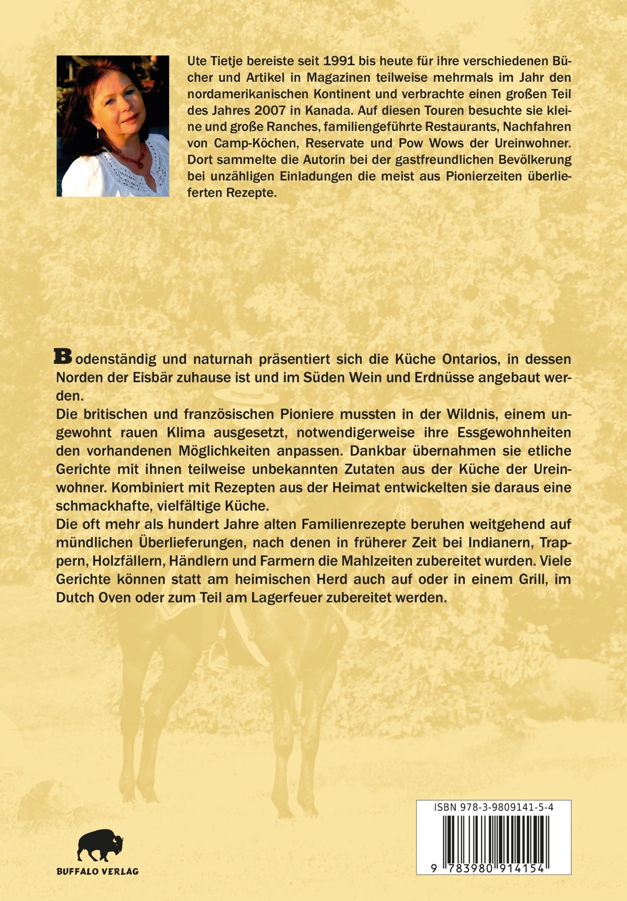 Die Autorin, eine begeisterte Natur- und Tierfotografin, bereiste seit 1991 mehrmals im Jahr den Südwesten der USA und verbrachte einen großen Teil des Jahres 2007 in Kanada. Auf ihren Reisen sammelte sie alte Familienrezepte bei Pow-Wows, Einladungen auf Ranches und anderen persönlichen Begegnungen mit den alten und neuen Einwohnern Nordamerikas. Die Rezepte beruhen weitgehend auf mündlichen Überlieferungen, nach denen in früherer Zeit bei Cowboys, Ranchern, Indianern, Trappern, Holzfällern, Händlern und Farmern die Mahlzeiten zubereitet wurden. Für jedes ihrer Bücher, egal ob Fachbuch oder Belletristik, recherchiert Ute Tietje vor Ort. So gehörte u.a. auch Andalusien seit 2000 zu ihren bevorzugten Zielen, ebenso wie viele andere Länder im Hinblick auf weitere Bücher.
