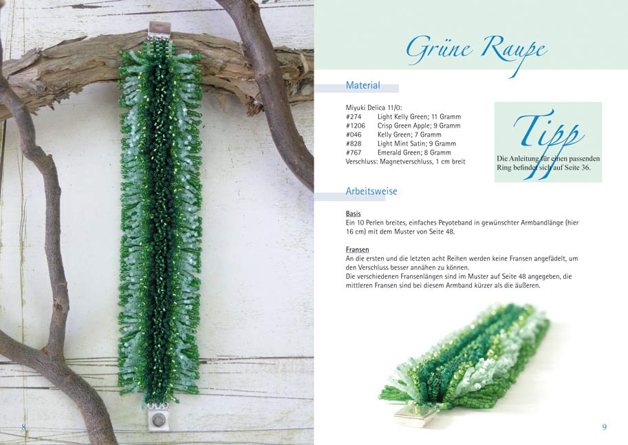 Die Grundtechnik der Schmuckstücke ist ganz einfach: Zuerst wird eine Basis z.B. für ein Armband geperlt, an der dann die Perlenfransen angefädelt werden. Hier sind vielfache Kombinationen möglich: Unterschiedliche Fransenlängen, verschiedene Basisformen und natürlich Farbvariationen. In diesem Buch werden die Grundtechniken mit bebilderten Basiskursen erklärt und jedes der über 15 Schmuckstücke wird ausführlich mit Material- und Arbeitsanweisungen erläutert. So entstehen außergewöhnliche Ketten, Armbänder und Ringe aus kleinen Glasperlen in einem ganz neuen Fransenlook.