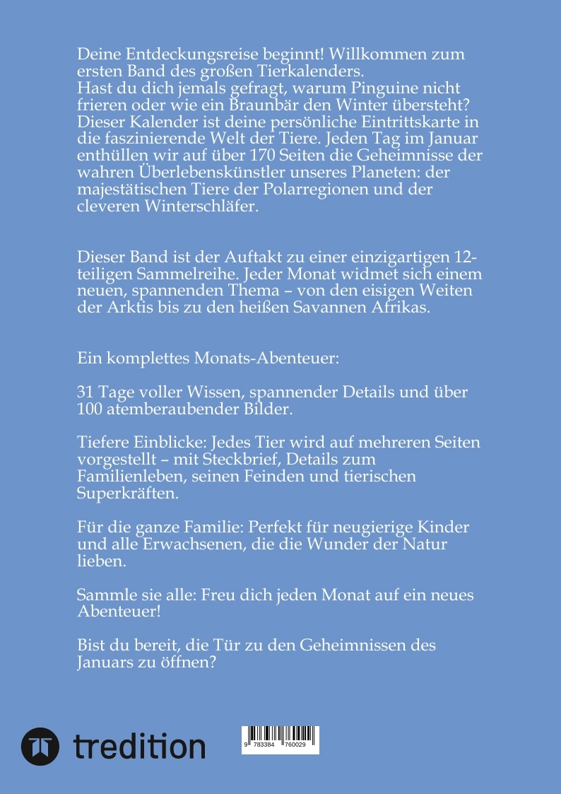 Deine Entdeckungsreise beginnt! Willkommen zum ersten Band des großen Tierkalenders.Hast du dich jemals gefragt, warum Pinguine nicht frieren oder wie ein Braunbär den Winter übersteht? Dieser Kalender ist deine persönliche Eintrittskarte in die faszinierende Welt der Tiere. Jeden Tag im Januar enthüllen wir auf über 170 Seiten die Geheimnisse der wahren Überlebenskünstler unseres Planeten: der majestätischen Tiere der Polarregionen und der cleveren Winterschläfer.Dieser Band ist der Auftakt zu einer einzigartigen 12-teiligen Sammelreihe. Jeder Monat widmet sich einem neuen, spannenden Thema - von den eisigen Weiten der Arktis bis zu den heißen Savannen Afrikas.Ein komplettes Monats-Abenteuer: 31 Tage voller Wissen, spannender Details und über 100 atemberaubender Bilder.Tiefere Einblicke: Jedes Tier wird auf mehreren Seiten vorgestellt - mit Steckbrief, Details zum Familienleben, seinen Feinden und tierischen Superkräften.Für die ganze Familie: Perfekt für neugierige Kinder und alle Erwachsenen, die die Wunder der Natur lieben.Sammle sie alle: Freu dich jeden Monat auf ein neues Abenteuer!Bist du bereit, die Tür zu den Geheimnissen des Januars zu öffnen?