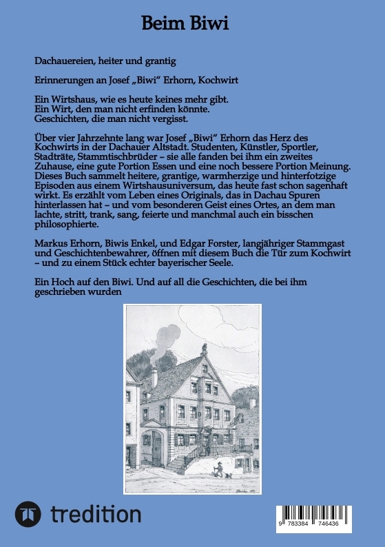 Beim Biwi - Dachauereien, heiter und grantigErinnerungen an Josef "Biwi" Erhorn, KochwirtEin Wirtshaus, wie es heute keines mehr gibt.Ein Wirt, den man nicht erfinden könnte.Geschichten, die man nicht vergisst.Über vier Jahrzehnte lang war Josef "Biwi" Erhorn das Herz des Kochwirts in der Dachauer Altstadt. Studenten, Künstler, Sportler, Stadträte, Stammtischbrüder - sie alle fanden bei ihm ein zweites Zuhause, eine gute Portion Essen und eine noch bessere Portion Meinung.Dieses Buch sammelt heitere, grantige, warmherzige und hinterfotzige Episoden aus einem Wirtshausuniversum, das heute fast schon sagenhaft wirkt. Es erzählt vom Leben eines Originals, das in Dachau Spuren hinterlassen hat - und vom besonderen Geist eines Ortes, an dem man lachte, stritt, trank, sang, feierte und manchmal auch ein bisschen philosophierte.Markus Erhorn, Biwis Enkel, und Edgar Forster, langjähriger Stammgast und Geschichtenbewahrer, öffnen mit diesem Buch die Tür zum Kochwirt - und zu einem Stück echter bayerischer Seele.Ein Hoch auf den Biwi. Und auf all die Geschichten, die bei ihm geschrieben wurden