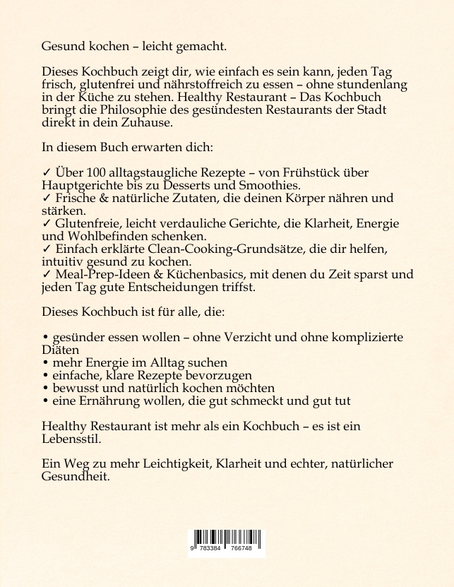 Healthy Restaurant - Das Kochbuch zeigt, wie einfach gesunde Ernährung im Alltag sein kann. Frisch, glutenfrei, nährstoffreich - ohne komplizierte Regeln. Mit über 120 Gerichten, klaren Routinen und einer modernen Clean-Cooking-Philosophie bietet dieses Buch einen ganzheitlichen Ansatz für mehr Energie, Balance und Wohlbefinden. Für alle, die gesund kochen, klar leben und ihre Ernährung dauerhaft verbessern möchten.