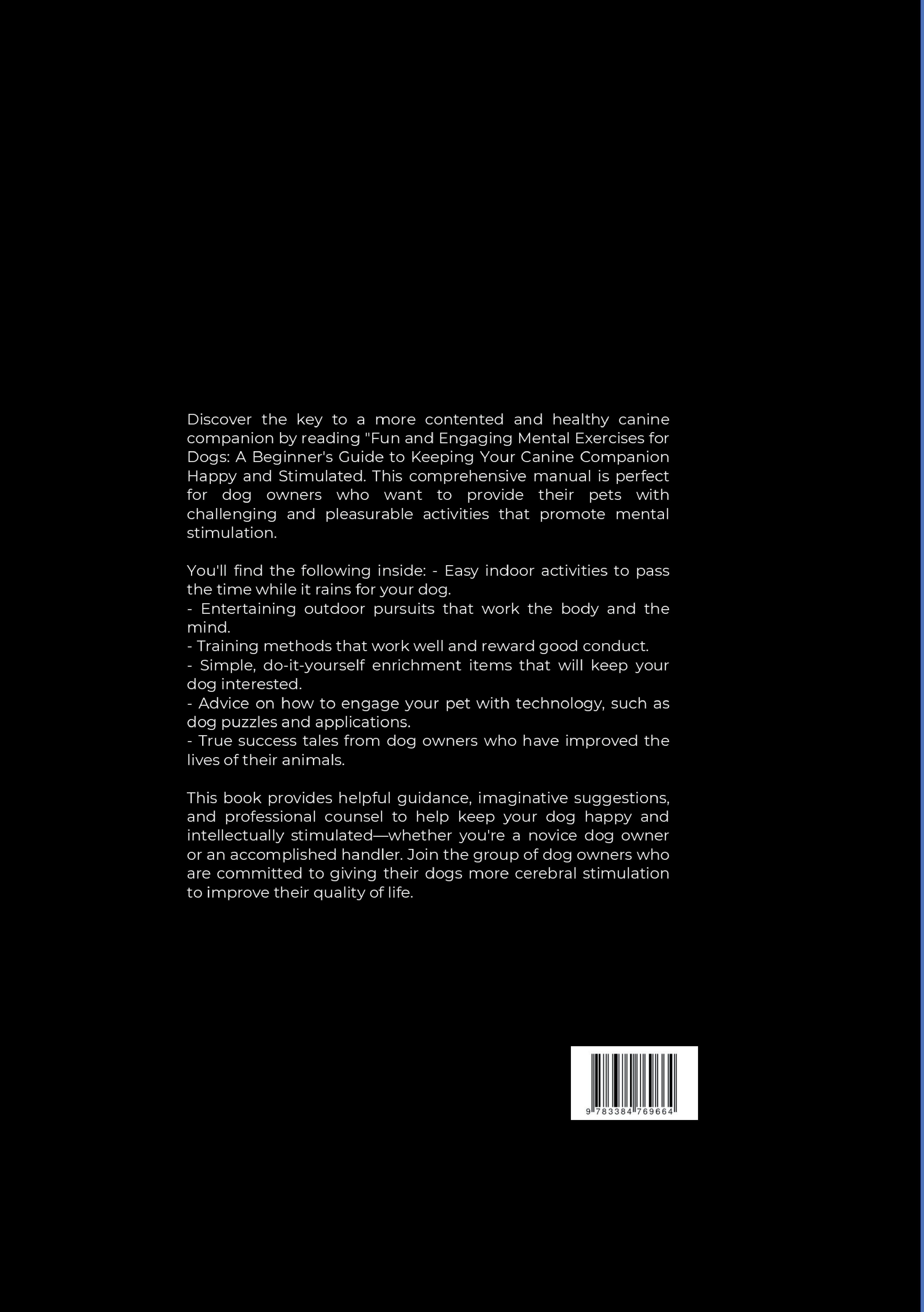 Discover the key to a more contented and healthy canine companion by reading "Fun and Engaging Mental Exercises for Dogs: A Beginner's Guide to Keeping Your Canine Companion Happy and Stimulated. This comprehensive manual is perfect for dog owners who want to provide their pets with challenging and pleasurable activities that promote mental stimulation.You'll find the following inside: - Easy indoor activities to pass the time while it rains for your dog.- Entertaining outdoor pursuits that work the body and the mind.- Training methods that work well and reward good conduct.- Simple, do-it-yourself enrichment items that will keep your dog interested.- Advice on how to engage your pet with technology, such as dog puzzles and applications.- True success tales from dog owners who have improved the lives of their animals.This book provides helpful guidance, imaginative suggestions, and professional counsel to help keep your dog happy and intellectually stimulated whether you're a novice dog owner or an accomplished handler. Join the group of dog owners who are committed to giving their dogs more cerebral stimulation to improve their quality of life.
