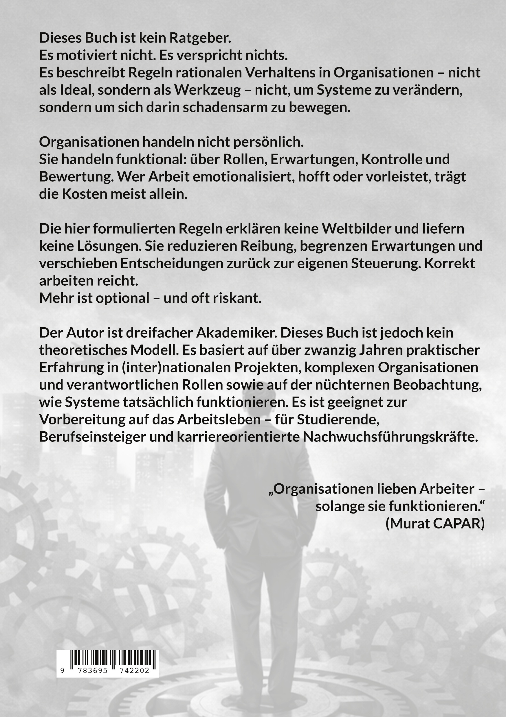 Das Buch formuliert, wie Organisationen tatsächlich funktionieren und welches Verhalten innerhalb von Unternehmen rational ist, unabhängig von individuellen Erwartungen, Motiven oder moralischen Vorstellungen. Im Mittelpunkt stehen Rollen, Funktionen, Leistung, Loyalität, Anpassung und Austauschbarkeit als systemische Konstanten.