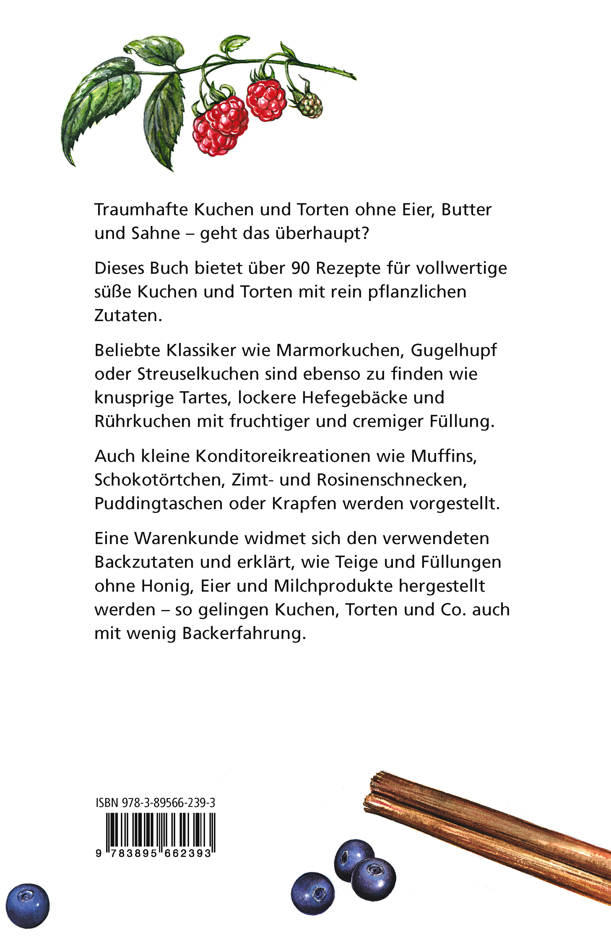 Traumhafte Kuchen und Torten ohne Eier, Butter und Sahne - geht das überhaupt? Für Veganer, aber auch für Allergiker und Personen mit Laktose-Intoleranz sind herkömmliche Backrezepte mit diesen Zutaten ein echtes Problem. Dieses Buch bietet Veganern mehr als 90 Rezepte für vollwertige süße Kuchen und Torten. Beliebte Klassiker wie Marmorkuchen, Gugelhupf, Streuselkuchen oder Cremetorte sind ebenso zu finden wie knusprige Tartes, lockere Hefegebäcke und Rührkuchen mit fruchtiger und cremiger Füllung. Auch kleine Konditoreikreationen wie Schokotörtchen, Muffins, Zimt- und Rosinenschnecken, Puddingtaschen oder Krapfen werden vorgestellt. Eine Warenkunde widmet sich den verwendeten Backzutaten und erklärt, wie Teige und Füllungen ohne Honig, Eier und Milchprodukte hergestellt werden.