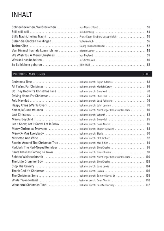 Traditionelle Weihnachtslieder:1. Alle Jahre wieder 2. Am Weihnachtsbaum die Lichter brennen3. Andachtsjodler4. Amen5. Ave Maria6. Bajuschki Baju7. Es ist ein Ros' entsprungen8. Engel haben Himmelslieder9. Es ist für uns eine Zeit angekommen10. Es wird scho' glei dumpa11. Freu Dich, Erd und Sternenzelt12. Fröhliche Weihnacht überall13. Go Tell It On The Mountain14. Hark! The Herald Angels Sing15. Heidschi, Bumbeidschi16. Heiligste Nacht17. Herbei, o ihr Gläub'gen18. Ich steh' an deiner Krippen hier19. Ihr Kinderlein kommet20. In dulci jubilo21. Joseph, lieber Joseph mein22. JingleBells23. Kling, Glöckchen24. Joy To The World25. Leise rieselt der Schnee26. Kommet, ihr Hirten27. Morgen, Kinder, wird's was geben28. Laßt uns froh und munter sein29. Macht hoch die Tür30. Maria durch ein Dornwald ging31. Morgen kommt der Weihnachtsmann32. O du fröhliche33. O Tannenbaum34. Schneeflöckchen, Weißröckchen35. Still, still, still36. Stille Nacht, heilige Nacht37. Vom Himmel hoch da komm ich her38. Süßer die Glocken nie klingen39. Tochter Zion40. Was soll das bedeuten41. We Wish You A Merry Christmas42. Zu Betlehem geborenPop Christmas Songs:43. All I Want For Christmas44. Christmas Time45. Do They Know It's Christmas46. Driving Home For Christmas47. Merry X-Mas Everybody48. Feliz Navidad49. Happy Xmas (War Is Over)50. Komm lass uns träumen51. Last Christmas52. Let It Snow, Let It Snow, Let It Snow53. Mary's Boychild54. Mistletoe And Wine55. Rockin' Around The Christmas Tree56. Rudolph, The Red-Nosed Reindeer57. Merry Christmas Everyone58. Santa Claus Is Coming To Town59. Schöne Weihnachtszeit60. Stop The Cavalry61. Thank God It's Christmas62. The Christmas Song63. The Little Drummer Boy64. Under The Christmas Tree65. Winter Wonderland