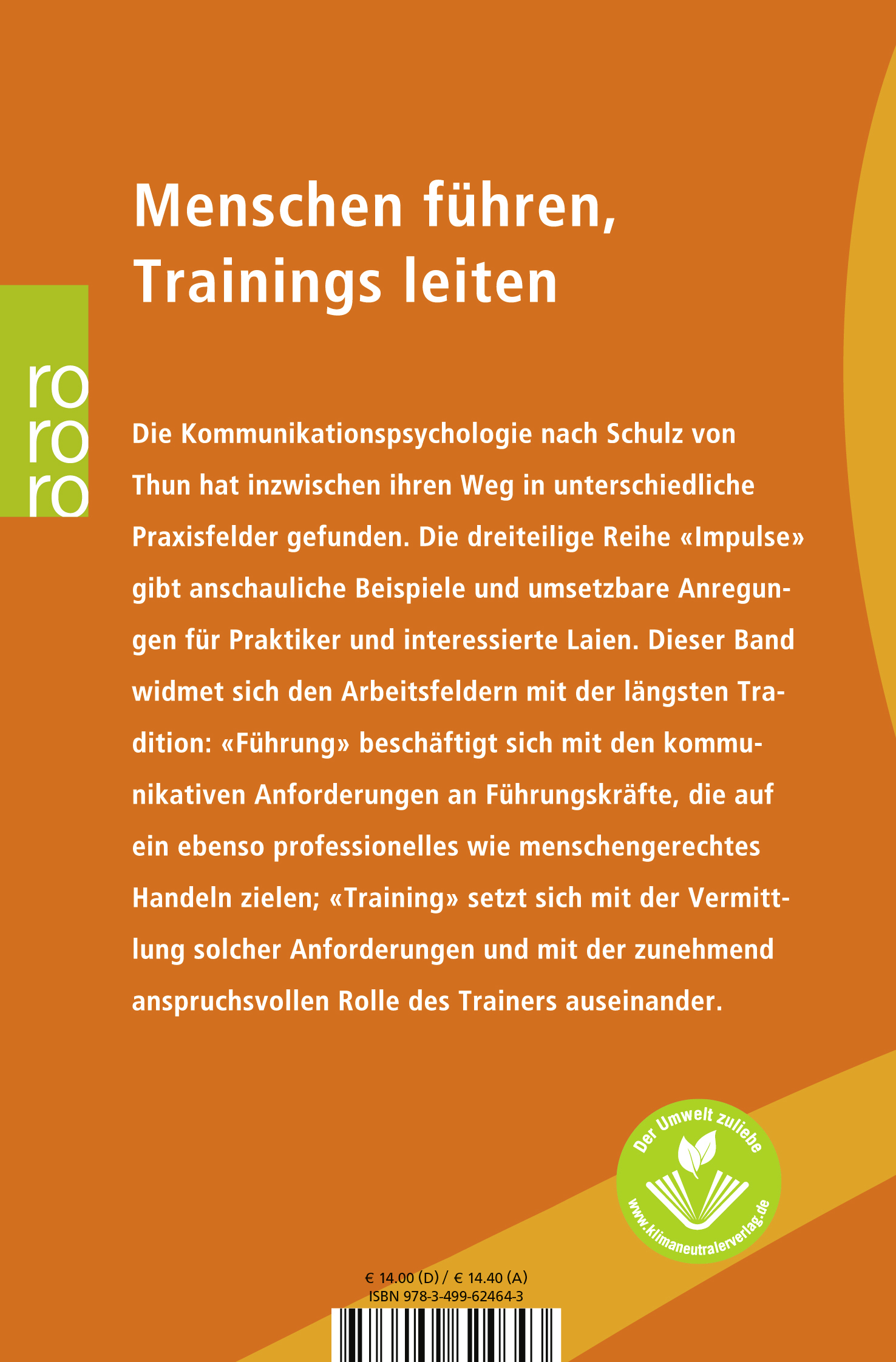 Die Kommunikationspsychologie nach Schulz von Thun hat inzwischen ihren Weg in unterschiedliche Praxisfelder gefunden. Die dreiteilige Reihe "Impulse" gibt anschauliche Beispiele und umsetzbare Anregungen für Praktiker und interessierte Laien. Dieser Band widmet sich den Arbeitsfeldern mit der längsten Tradition: "Führung" beschäftigt sich mit den kommunikativen Anforderungen an Führungskräfte, die auf ein ebenso professionelles wie menschengerechtes Handeln zielen; "Training" setzt sich mit der Vermittlung solcher Anforderungen und mit der zunehmend anspruchsvollen Rolle des Trainers auseinander.
