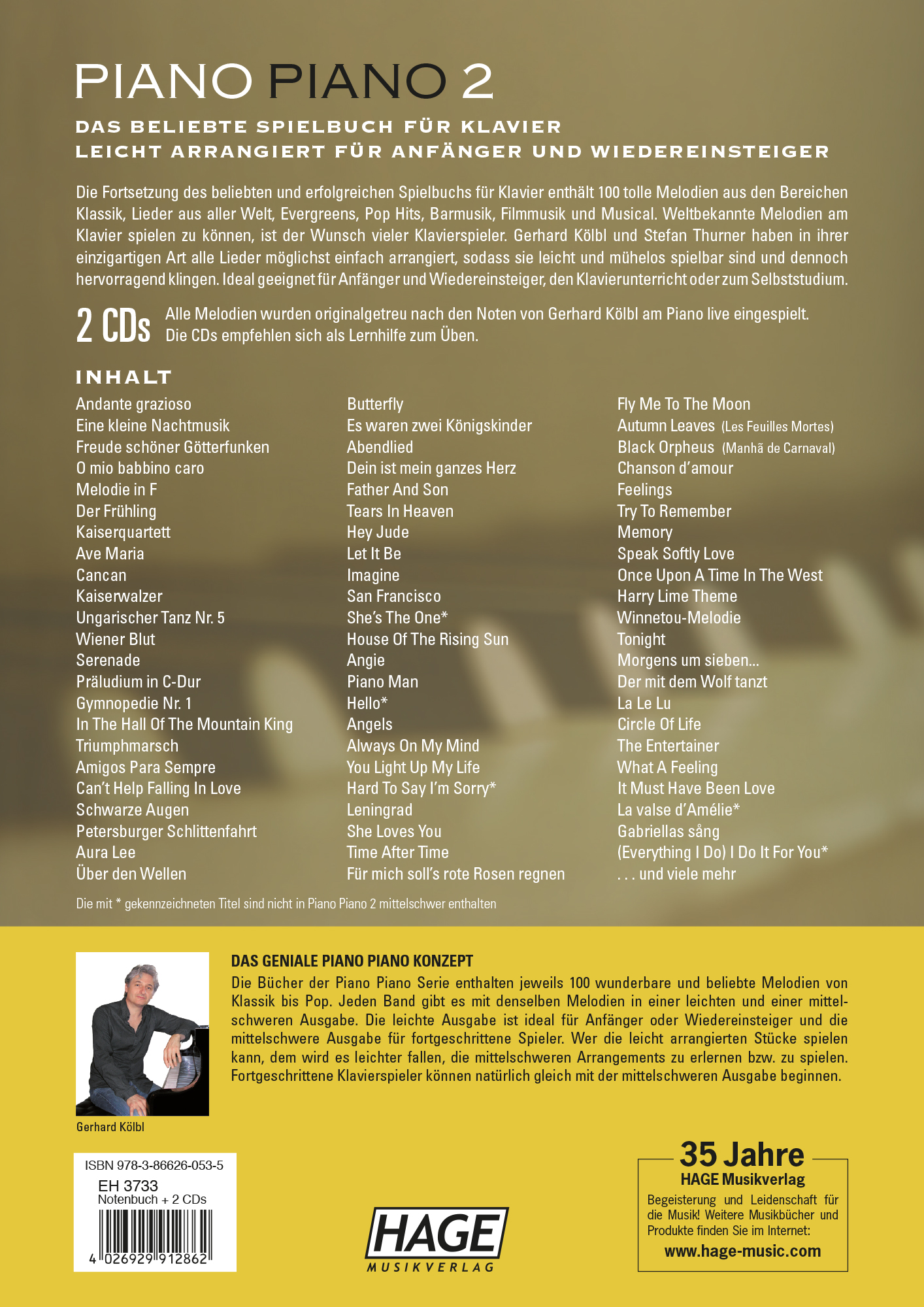 Die Fortsetzung des beliebten und erfolgreichen Spielbuchs für Klavier enthält 100 tolle Melodien aus den Bereichen Klassik, Lieder aus aller Welt, Evergreens, Pop Hits, Barmusik, Filmmusik und Musical.Weltbekannte Melodien am Klavier spielen zu können, ist der Wunsch vieler Klavierspieler. Gerhard Kölbl und Stefan Thurner haben in ihrer einzigartigen Art alle Lieder möglichst einfach arrangiert, sodass sie leicht und mühelos spielbar sind und dennoch hervorragend klingen. Ideal geeignet für Anfänger und Wiedereinsteiger, den Klavierunterricht oder zum Selbststudium.Damit das Buch offen liegen bleibt und sehr leicht umgeblättert werden kann, wurde es mit einer hochwertigen PUR-Klebebindung gebunden. Der Buchrücken kann nach hinten umgeknickt werden.