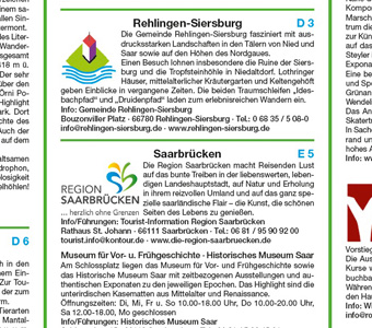 Der Erlebnisführer Saarland informiert umfassend über das „kleine Land im Herzen Europas“. Im Kartenteil markieren Fähnchen Ausflugsziele und verschaffen einen Überblick über die Landschaft: Mosel, Saar, der Naturpark Saar-Hunsrück, Städte wie Saarbrücken, Saarlouis, Blieskastel, St. Wendel, aber auch die Grenzregion Frankreichs und Luxemburgs kommen ins Blickfeld. Die Rückseite bietet Infos und Fotos zu Städten im Saarland und in Frankreich. Neben Burgen, Bergwerken und historischen Ortskernen werden sportliche Aktivitäten im Erlebnisführer Saarland vorgestellt.
