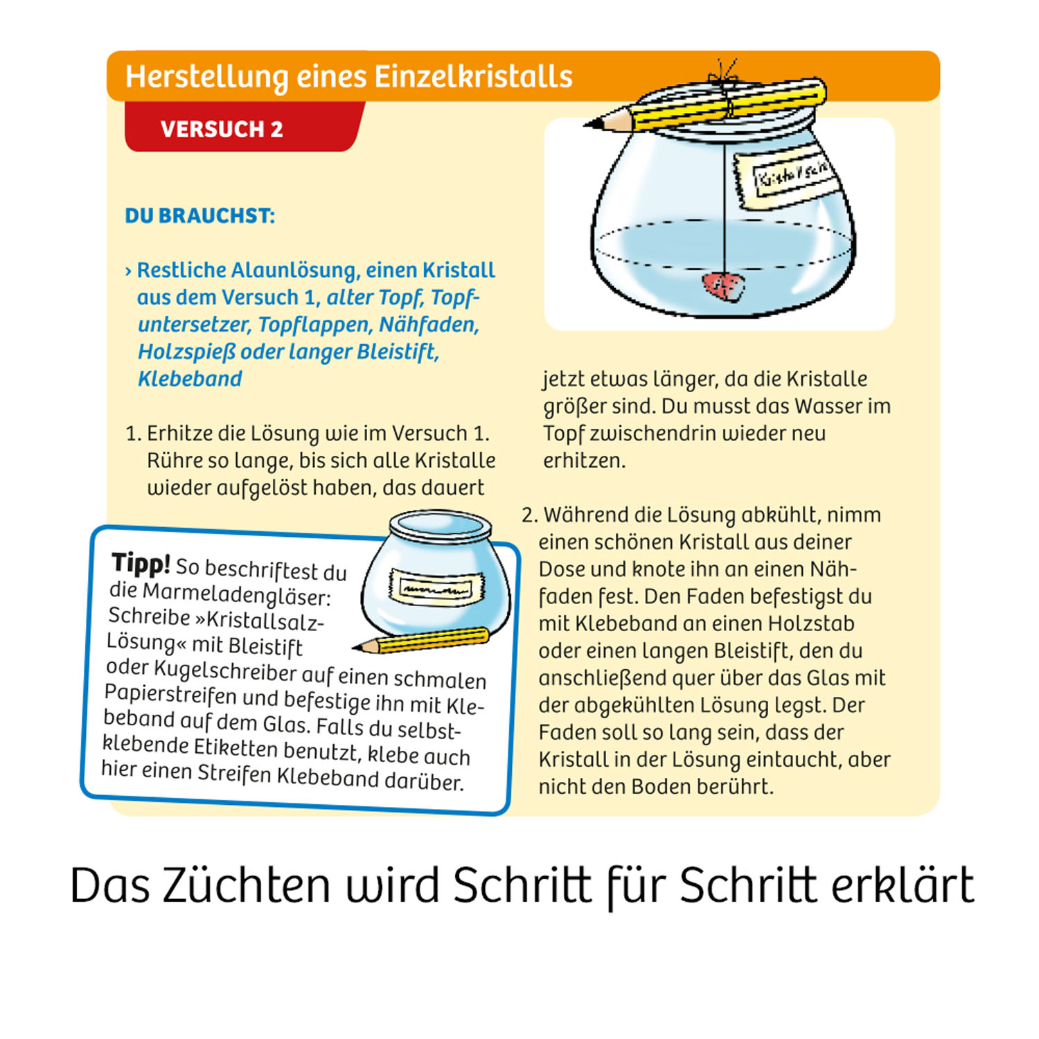 Auf spielerische Weise experimentieren Kinder beim Züchten mit unterschiedlichen Lösungen und entdecken so erste Aspekte der Chemie. In der leicht verständlichen farbigen Anleitung wird Schritt für Schritt erklärt, wie die Kristalle gezüchtet werden. Ab 10 Jahren.
