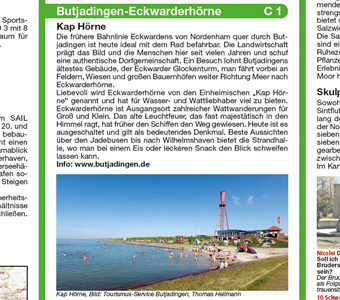 Im Mündungsbereich der Weser in die Nordsee gibt es viel zu entdecken. Die Halbinsel Butjadingen bietet sich für Radler und Wanderer gleichermaßen an: Markierte Rad- und Wanderwege ermöglichen eine Erkundung der von Mooren durchzogenen Landschaft und eine Berührung mit dem Nationalpark Niedersächsisches Wattenmeer. Auf der anderen Seite der Weser wartet Bremerhaven mit maritimen Sehenswürdigkeiten auf Besucher. Die Rückseite der Rad- und Wanderkarte informiert auch umfassend über Sehenswürdigkeiten in der gesamten Region.