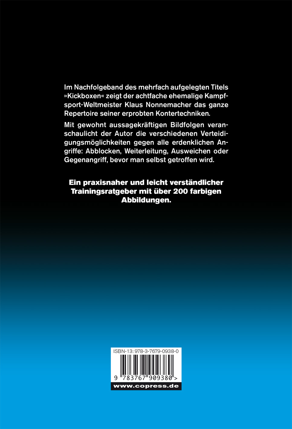 Im Nachfolgeband des mehrfach aufgelegten Titels 'Kickboxen' zeigt der achtfache ehemalige Kampfsport-Weltmeister Klaus Nonnemacher das ganze Repertoire seiner erprobten Kontertechniken. Mit gewohnt aussagekräftigen Bildfolgen veranschaulicht der Autor die verschiedenen Verteidigungsmöglichkeiten gegen alle erdenklichen Angriffe: Abblocken,Weiterleitung, Ausweichen oder Gegenangriff, bevor man selbst getroffen wird.