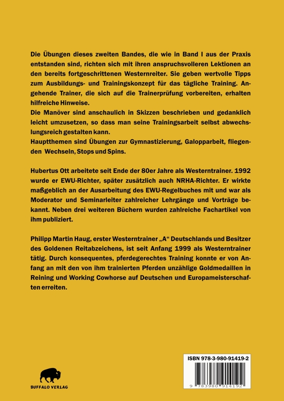 Hubertus Ott wurde 1950 in Würzburg geboren und wuchs in der elterlichen FN-Reitschule in Föhr auf. Dort erhielt er eine fundierte Ausbildung in der Klassischen Reitweise. Nach dem Abitur studierte er Kunstpädagogik und arbeitete anschließend 15 Jahre als Ausstatter, Szenenbildner und Requisiteur beim Fernsehen. In dieser Zeit wuchs sein Interesse am Westernreitsport. Er besuchte Kurse und Lehrgänge u.a. bei Linda Tellington-Jones, Lutz Leckebusch und Pete Kreinberg. Nach längeren Aufenthalten bei namhaften US-Trainern machte sich Hubertus Ott Anfang der 90er Jahre als Westerntrainer und Züchter von Westernpferderassen selbstständig. Seit 1989 Mitglied der EWU (Erste Westernreiter Union), übernahm er mit Leidenschaft kontinuierlich in wichtigen Ämtern Verantwortung. Er war seit 1992 als Turnierrichter der EWU und der NRHA (National Reining Horse Association) tätig und richtete u.a. die Schweizer Meisterschaften, viele A/Q-Turniere sowie auch das Warendorfer Breitensportfestival. Als Richter war er quer durch das Bundesgebiet unterwegs und wurde von den Reitern wegen seiner Fairness und Kompetenz geschätzt. Als Moderator und Seminarleiter zahlreicher Lehrgänge und Vorträge u.a. für die Deutsche Akademie des Pferdes und die FN wie z.B. des 13. Hippo-logischen Forums in Warendorf, „Klassik meets Western“ in Luhmühlen und Neversdorf, machte er sich ebenso einen Namen wie mit vier weiteren Büchern und zahlreichen Fachartikeln. Seit 2002 lebte und arbeitete Hubertus Ott mit seiner Frau Esther und sei-ner Tochter Pia auf Gut Schnede in der Lüneburger Heide, wo er eine FN- Reitschule Westernreiten mit Trainingsstall leitete. Er wirkte maßgeblich an der Umstrukturierung des Turnierklassensystems der EWU in Leistungsklassen nach FN-Modell mit. Hubertus Ott hatte gera-de erst das neue Regelbuch der EWU ausgearbeitet, eine immense Aufga-be, als er am 9. Februar 2006 unerwartet verstarb.