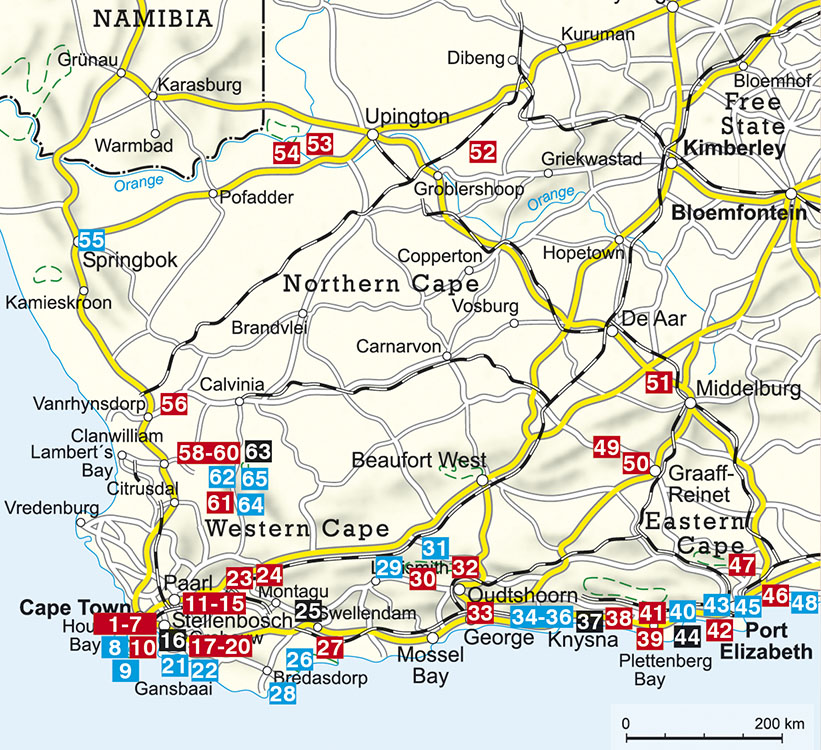 Der Wanderführer umfasst die drei Kap-Provinzen im Westteil des Landes, mit Küsten, Bergen und Halbwüsten, unterteilt in acht ganz unterschiedliche Wandergebiete: Den Anfang machen die weltberühmte Halbinsel zwischen Kapstadt und dem Kap der Guten Hoffnung sowie der mehr als 1000 m hohe Tafelberg. In den Cape Winelands lässt sich eine Gipfelbesteigung angenehm mit einer Weinverkostung auf einem der vielen Weingüter verbinden. Die Garden Route lockt mit spektakulären Küstenabschnitten; Glattwale sind an der Whale Coast der Overberg-Region zu beobachten. Auch die Trockengebiete der Karoo gilt es zu Fuß zu entdecken, ebenso die Savannen des Augrabies Falls National Park an der Grenze zu Namibia im Norden und die Sanddünen am Rand des Addo Elephant National Park im Osten. Und schließlich darf auch die abgelegene 'Mondlandschaft' der Cederberge nicht fehlen.
