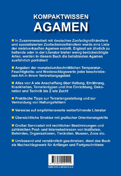 Das 246 Fotos und 102 Grafiken umfassende Werk porträtiert ausführlich die beliebtesten Agamen. Ausgestattet mit herkunftsgebietbezogenen Temperatur-, Luftfeuchtigkeits- und Niederschlagswerten und ergänzt durch einen umfangreichen Allgemeinteil über Pflege und Ernährung sowie Terrariendekoration und -technik ist das Buch ein unverzichtbares Nachschlagewerk für jeden Agamenliebhaber.