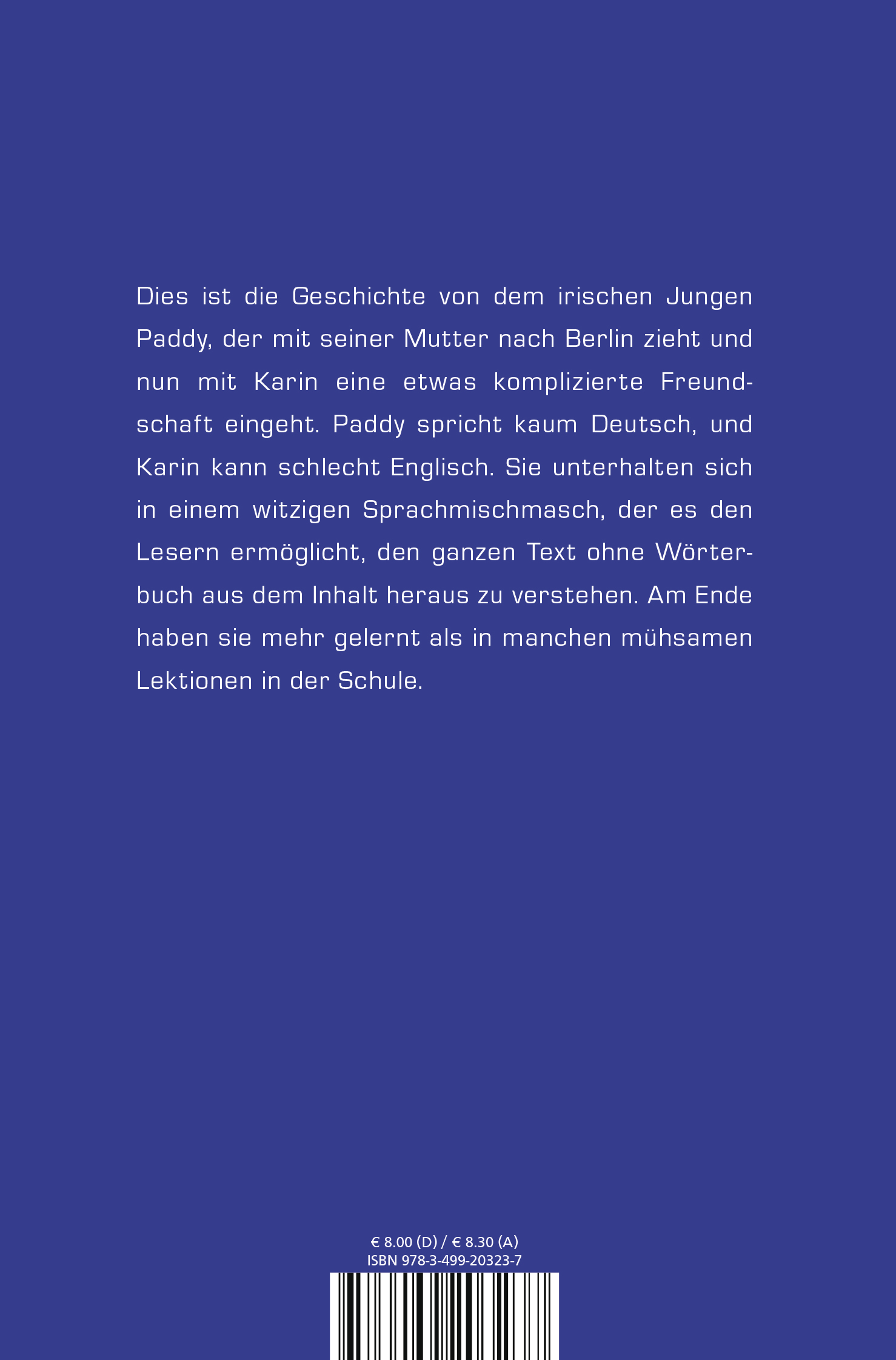 Dies ist die Geschichte von dem irischen Jungen Paddy, der mit seiner Mutter nach Berlin zieht und nun mit Karin eine etwas komplizierte Freundschaft eingeht. Paddy spricht kaum Deutsch, und Karin kann schlecht Englisch. Sie unterhalten sich in einem witzigen Sprachmischmasch, der es den Lesern ermöglicht, den ganzen Text ohne Wörterbuch aus dem Inhalt heraus zu verstehen. Am Ende haben sie mehr gelernt als in manchen mühsamen Lektionen in der Schule.