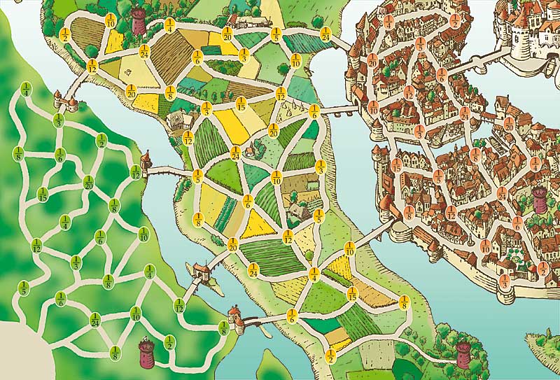 Wer möchte nicht gerne auf einer Burg wohnen? Der Weg dahin ist nicht ganz einfach. Vom Wald aus geht es über Äcker, Wiesen, Brücken und Flüsse. Das Überqueren von Brücken und das Betreten der Stadt ist jedoch nicht kostenlos: Es muss Zoll bezahlt werden. Glücklicherweise lassen sich unterwegs ständig Brüche sammeln und nach und nach die benötigten Zollkarten füllen. Ist die Zollkarte bei der Ankunft an der Zollstation jedoch noch nicht ganz voll, muss ein Umweg gegangen werden, um die restlichen Brüche einzusammeln. Doch Vorsicht: Ein Räuber treibt sein Unwesen und wartet nur darauf, die Spieler auf ihrem Weg zum Schloss zu überfallen. Wer gelangt trotz aller Tücken und Hindernisse zuerst zur Burg?