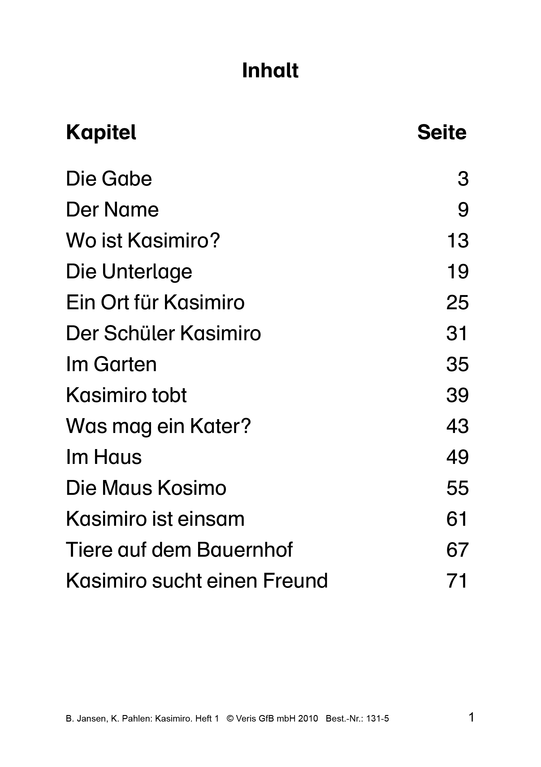 Lautgetreue Lesegeschichten für Leseanfänger*innen und leseschwache Kinder rund um den kleinen Kater Kasimiro.Als Oma eines Tages ihre beiden Enkel Tina und Toni besucht, kommt sie nicht allein. Sie hat Ihnen einen kleinen Kater mitgebracht. Fortan erleben Tina, Toni und der Kater, der den Namen Kasimiro erhält, viele kleine Abenteuer und entdecken dabei die Welt.Aus der Sicht des kleinen Katers Kasimiro geschrieben, erscheinen Selbstverständlichkeiten als große Probleme und große Probleme als Banalitäten - ob es nun ums Essen geht oder um Freundschaft.Birgit Jansen hat die Geschichten um den Kater Kasimiro für Leseanfänger*innen und leseschwache Kinder geschrieben. Die Texte sind durchgängig lautgetreu, ergänzt durch kleine wichtige Wörter, und entsprechen den Lesestufen 1-8 des Kieler Leseaufbaus.Katharina Pahlen hat dem Kater Kasimiro ein Gesicht gegeben und mit ihren liebevollen Illustrationen dafür gesorgt, dass das Lesen der Geschichten über den kleinen Kater zu einem unvergesslichen Erlebnis wird.Heft 1 enthält 14 Geschichten mit aufsteigendem Schwierigkeitsgrad. Eine große, gut lesbare Schrift und die Verwendung nicht zu langer, einfach strukturierter Wörter ohne Konsonantenhäufung sorgen für den perfekten Einstieg in das Lesenlernen!Das Heft eignet sich auch zum Vorlesen für Kindergartenkinder und Vorschüler*innen.