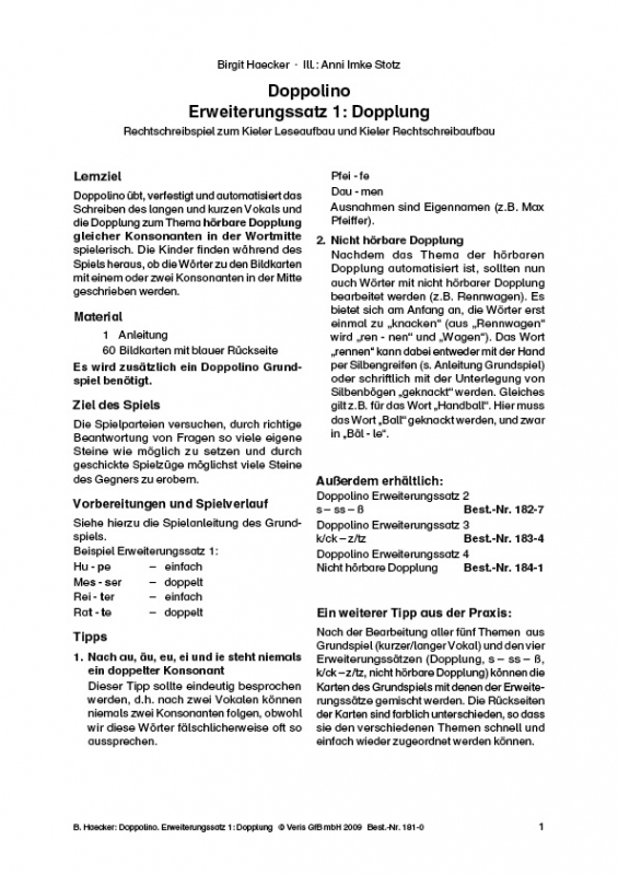 Der Erweiterungssatz 1 zum Grundspiel Doppolino behandelt das Thema Dopplung.Die liebevoll illustrierten Bildkarten sind vielseitig einsetzbar. Sie eignen sich für Bilddiktate mit Selbstkorrektur und vieles mehr. Eine Übersicht mit den dazugehörigen Begriffen ist nach dem Alphabet gegliedert und erlaubt einen ersten Zugang zur späteren Arbeit mit dem Wörterbuch.Die Bildkarten der einzelnen Erweiterungssätze haben jeweils anders farbige Rückseiten. So können Sie Ihre Schüler*innen mit unterschiedlichen Rechtschreibproblemen gleichzeitig fördern.Voraussetzung für die Nutzung des Kartensatzes als Spiel ist das Grundspiel.