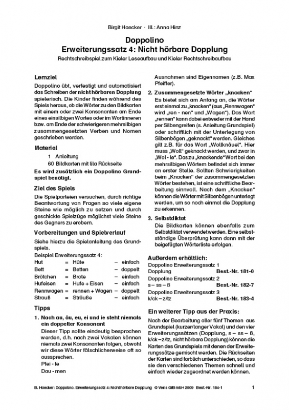 Der Erweiterungssatz 4 zum Grundspiel Doppolino behandelt das Thema nicht hörbare Dopplung.Die liebevoll illustrierten Bildkarten sind vielseitig einsetzbar. Sie eignen sich für Bilddiktate mit Selbstkorrektur und vieles mehr. Eine Übersicht mit den dazugehörigen Begriffen ist nach dem Alphabet gegliedert und erlaubt einen ersten Zugang zur späteren Arbeit mit dem Wörterbuch.Die Bildkarten der einzelnen Erweiterungssätze haben jeweils anders farbige Rückseiten. So können Sie Ihre Schüler*innen mit unterschiedlichen Rechtschreibproblemen gleichzeitig fördern.Voraussetzung für die Nutzung des Kartensatzes als Spiel ist das Grundspiel.