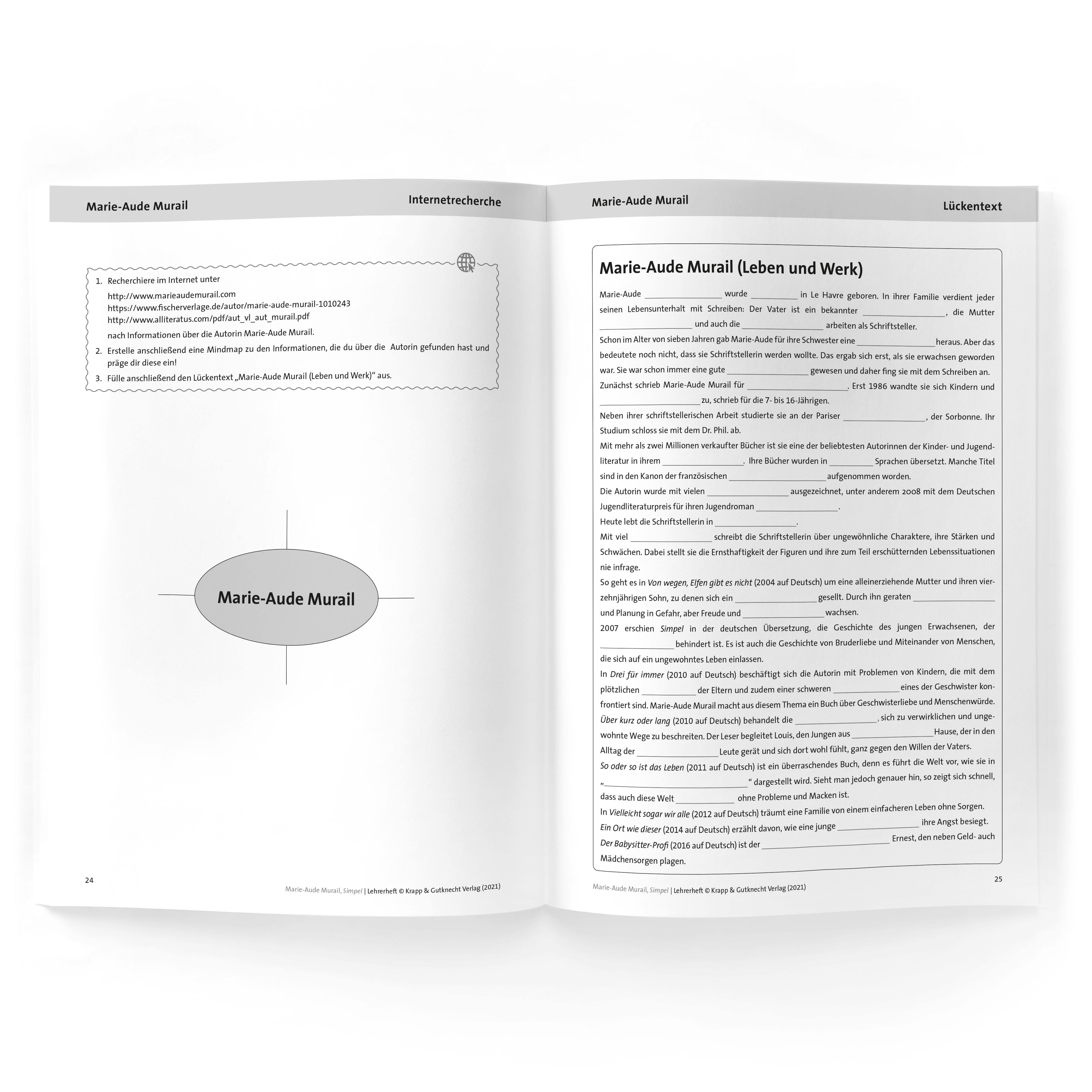 Junge Protagonisten mit Herzen Auf der Suche nach einer Wohnung landen der 17-jährige Colbert und sein älterer Bruder Barnabé, genannt Simpel, in einer Pariser Studenten-WG. Colbert kümmert sich um Simpel, der auf der mentalen Entwicklungsstufe eines Dreijährigen steht, und dieser stellt in Komplizenschaft mit seinem Stofftier Monsieur Hasehase die WG auf den Kopf, dabei zeigt er seinen Mitbewohnern auf seine Weise, wie simpel viele Dinge im Leben sein können. Marie Aude Murails herzlicher Roman erhielt 2008 den Deutschen Jugendliteraturpreis der Jugendjury und kam als Spielfilm im November 2017 in die deutschen Kinos. Das Lehrerheft enthält - Inhalt des Romans und Interpretationsaspekte - Figurenanalyse - Arbeit mit dem Hörbuch - Methodisch-didaktischer Kommentar - Wochenplan zur Lektüre - Sprache und Stil - Hinweise zu den Themenschwerpunkten des Schülerheftes - ergänzende Unterrichtsmaterialien - Aufgaben aus der Theaterpädagogik - Informationen und Aufgaben zu geistiger Behinderung - Kopiervorlagen - Vorschläge für Klassenarbeiten - Musterlösungen und Lösungshinweise Das Schülerheft ist erhältlich unter der ISBN: 9783941206366 und enthält - Lückentext zum Inhalt - Charakterisierung der Figuren und deren Beziehungen (Simpel/Monsieur Hasehase, Simpel/Colbert, Simpels "Familien") - Sprache und Stil - Interpretieren und kritisieren - Aufgabenwerkstatt