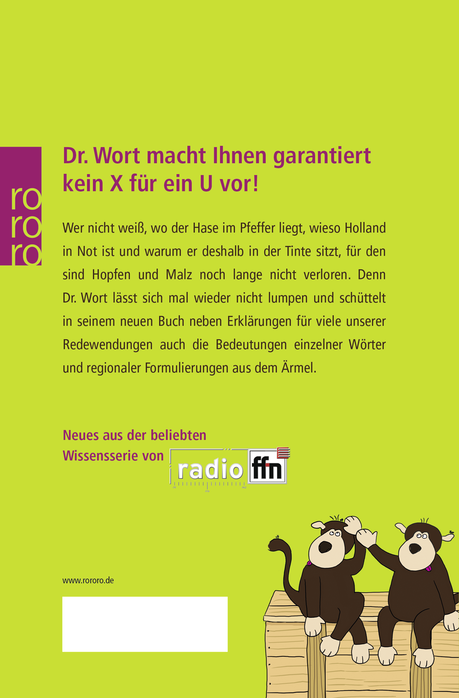 Dr. Wort macht Ihnen garantiert kein X für ein U vor!Wer nicht weiß, wo der Hase im Pfeffer liegt, wieso Holland in Not ist und warum er deshalb in der Tinte sitzt, für den sind Hopfen und Malz noch lange nicht verloren. Denn Dr. Wort lässt sich mal wieder nicht lumpen und schüttelt in seinem neuen Buch neben Erklärungen für viele unserer Redewendungen auch die Bedeutungen einzelner Wörter und regionaler Formulierungen aus dem Ärmel.Neues aus der beliebten Wissensserie von radio ffn