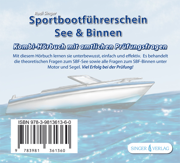 Mit dem Hörbuch zum Sportbootführerschein See und Binnen lernen sie mit 4 CDs unterbewusst und effektiv die Fragen für die Prüfung. Es werden alle theoretischen Fragen mit Antworten vorgelesen und komplizierte Sachverhalte wurden vom Autor kommentiert und sie hören die Erklärungen dazu.