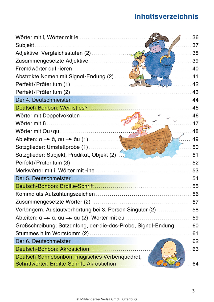 In den Übungshefte für die Klassen 1 bis 4 werden die jeweils wichtigsten Lerninhalte der beiden Grundsäulen des Deutschunterrichts, Rechtschreibung und Grammatik, spiralförmig wiederholt und vertieft. Die wichtigsten Lerninhalte werden in Schatzkisten übersichtlich zusammengefasst und somit die Wissensschätze noch deutlicher hervorgehoben. In regelmäßigen Abständen werden die erarbeiteten Inhalte beim Deutschmeister abgefragt. Die zusätzlichen Deutsch-Bonbons -Seiten bieten besondere Aufgaben wie Rätsel, Geheimschrift und Spiele.