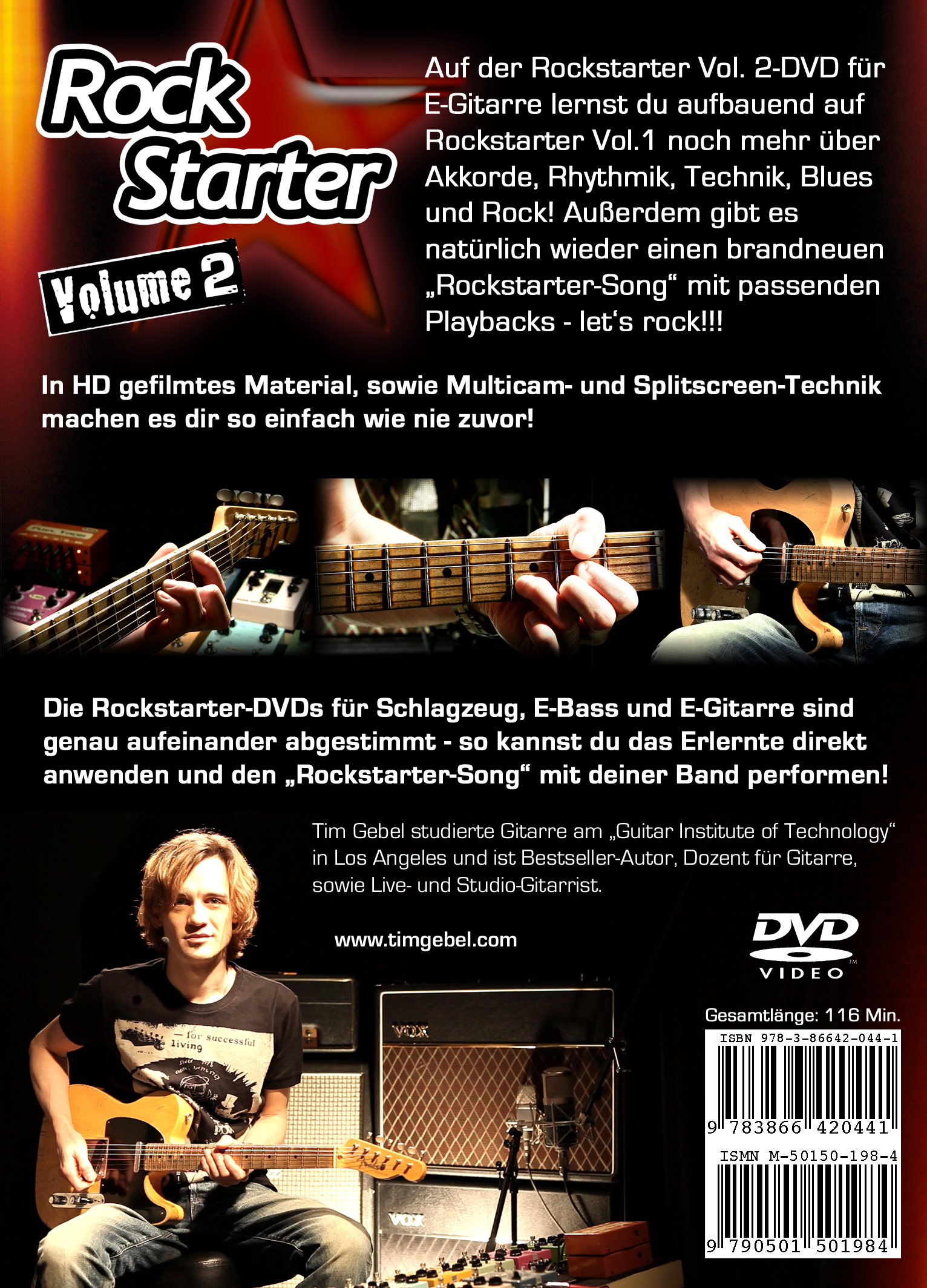 Auf der Rockstarter Vol. 2-DVD für E-Gitarre lernst du aufbauend auf "Rockstarter Vol. 1" noch mehr über Akkorde, Rhythmik, Technik, Blues und Rock! Selbstverständlich ausführlich und sympathisch erklärt von Autor und Gitarrist Tim Gebel! Außerdem gibt es natürlich wieder einen brandneuen "Rockstarter-Song" mit passenden Playbacks - let's rock! In HD gefilmtes Material, sowie Multicam- und Splitscreen-Technik machen es dir so einfach wie nie zuvor! Die Rockstarter-DVDs für Schlagzeug, E-Bass und E-Gitarre sind genau aufeinander abgestimmt - so kannst du das Erlernte direkt anwenden und den "Rockstarter-Song" mit deiner Band performen! Die perfekte Lehr-DVD-Serie um erfolgreich und mit einer Menge Spaß dein Lieblingsinstrument zu erlernen!
