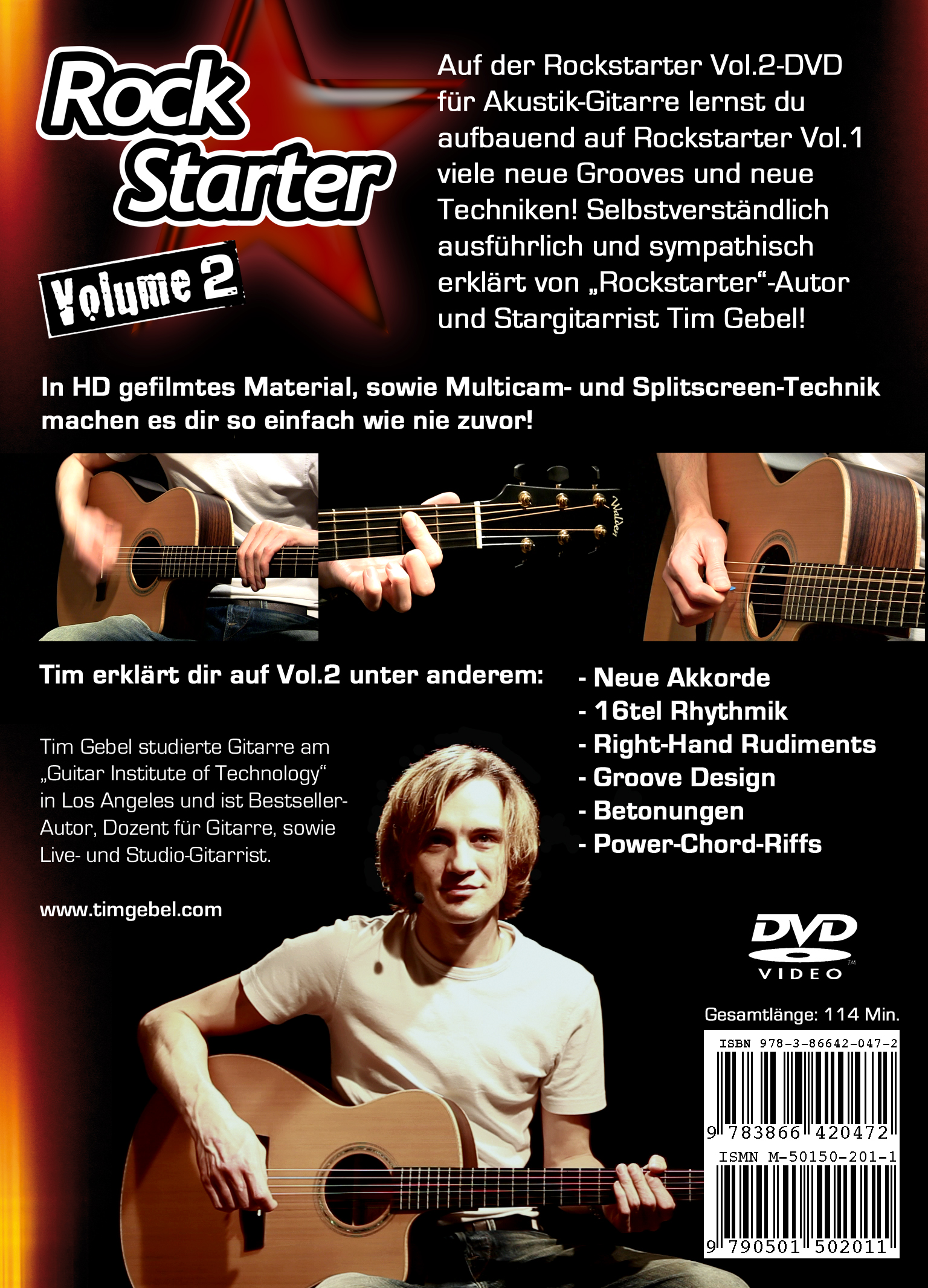 Auf der Rockstarter Vol. 2-DVD für Akustikgitarre lernst du aufbauend auf "Rockstarter Vol. 1" viele neue Grooves und neue Techniken. Selbstverständlich ausführlich und sympathisch erklärt von Autor und Gitarrist Tim Gebel. Tim erklärt dir auf Vol. 2 unter anderem neue Akkorde, 16tel Rhythmik, Right-Hand Rudiments, Groove Design, Betonungen, Power-Chord-Riffs und vieles mehr. In HD gefilmtes Material, sowie Multicam- und Splitscreen-Technik machen es dir so einfach wie nie zuvor. Die perfekte Lehr-DVD-Serie um erfolgreich und mit einer Menge Spaß dein Lieblingsinstrument zu erlernen!