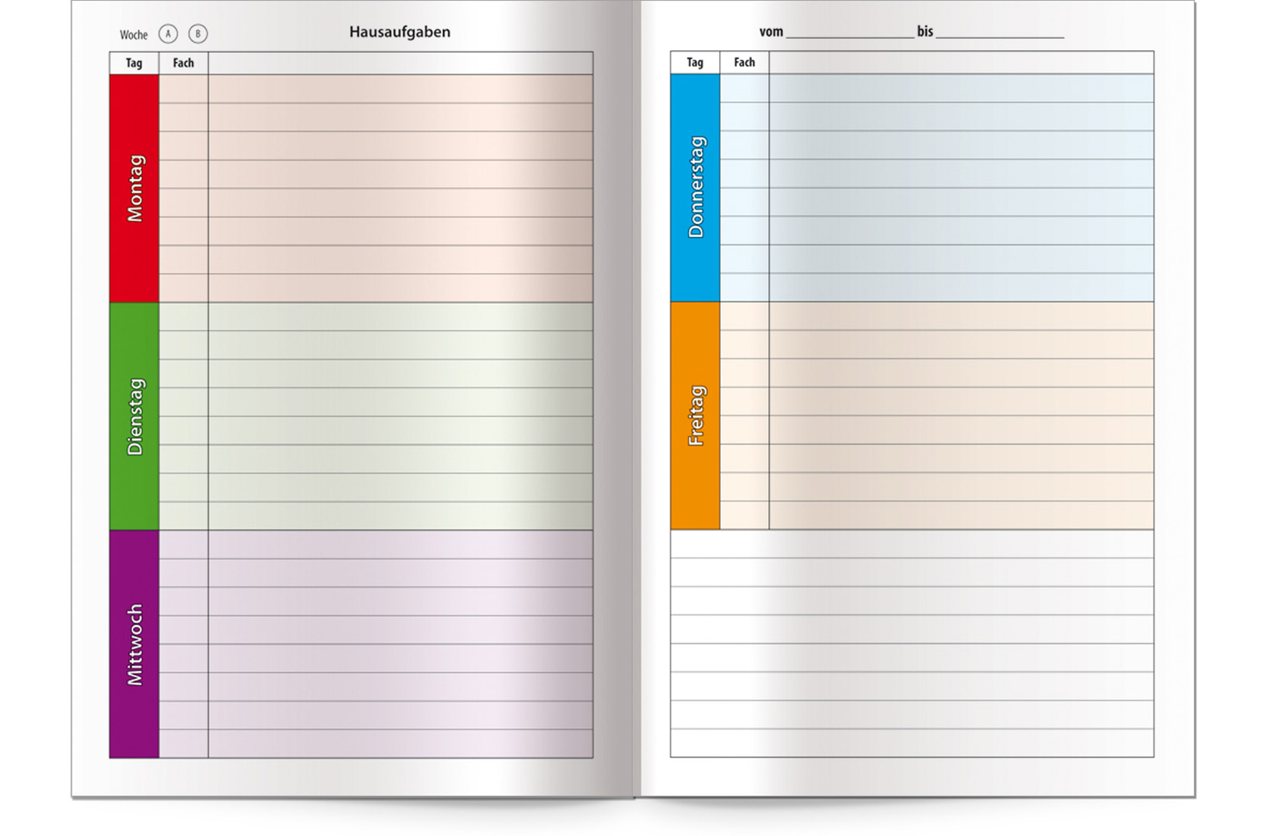 Das Hausaufgabenheft ABC im A5-Format ist speziell auf die Wünsche von 1.-4. Klasse abgestimmt.Die Wochentage sind in verschiedenen Farben gehalten, so dass Schüler der 1.-4. Klasse einfach Ihre Hausaufgaben eintragen können.Format: A5, 96 Seiten, eine Woche auf 2 Seiten, jeder Tag hat eine eigene Farbe, mit A- und B-Woche, mit extra starkem Klarsichtumschlag