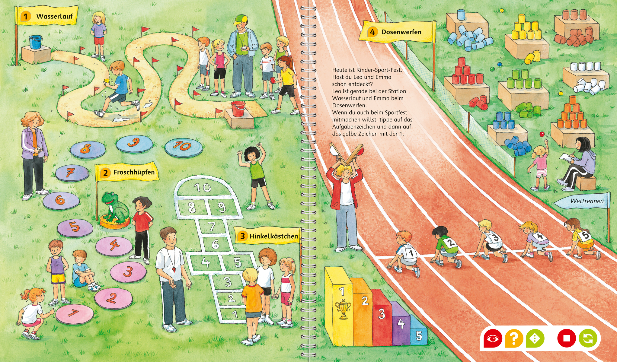 Emma und Leo entdecken in diesem tiptoi® Lern-Spiel-Abenteuer die Welt der Zahlen. Ob beim Geburtstagsfest, im Zoo, beim Einkaufen, beim Sportfest oder im Kindergarten - Zahlen, Mengen und mathematische Zusammenhänge finden die beiden Kindergartenkinder überall.