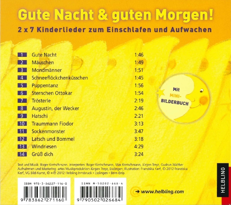 Die liebevoll präsnetierten Lieder zum Einschlafen und Aufwachen laden nicht nur die ganz Kleinen zum Abschalten und Zuhören ein. 14 warmherzige und fantasievolle Lieder regen Eltern wie Vorschulkinder an, hörend und singend den Übergang vom Tag in die Nacht zu vollziehen, oder sich bei Guten Morgen-Liedern zu begegnen, die Lust auf den Tag und alles Kommende machen. Die Arrangements sind farbenreich gestaltet und ausschließlich akustisch eingespielt. Ein liebevoll bebildertes kleines Booklet mit allen Liedtexten rundet den Tonträger ab und macht ihn zu einem besonderen Geschenk.