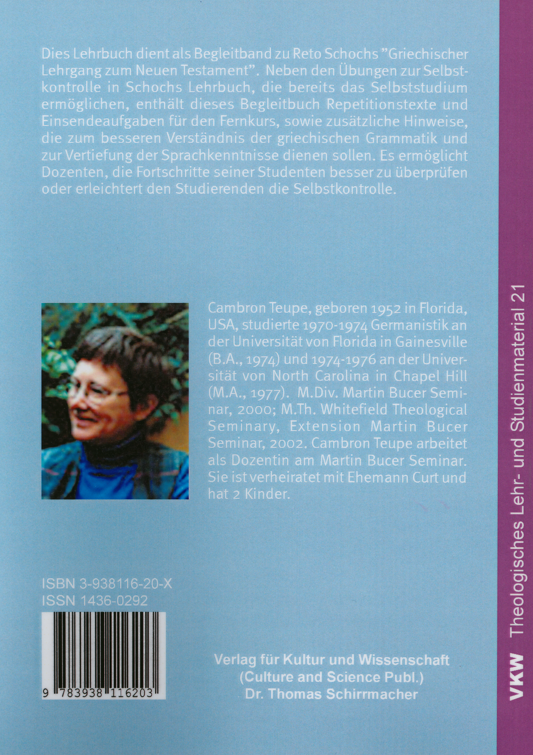 Dies Lehrbuch dient als Begleitband zu Reto Schochs ”Griechischer Lehrgang zum Neuen Testament”. Neben den Übungen zur Selbst-kontrolle in Schochs Lehrbuch, die bereits das Selbststudium ermöglichen, enthält dieses Begleitbuch Repetitionstexte und Einsendeaufgaben für den Fernkurs, sowie zusätzliche Hinweise, die zum besseren Verständnis der griechischen Grammatik und zur Vertiefung der Sprachkenntnisse dienen sollen. Es ermöglicht Dozenten, die Fortschritte seiner Studenten besser zu überprüfen oder erleichtert den Studierenden die Selbstkontrolle. Cambron Teupe, geboren 1952 in Florida, USA, studierte 1970-1974 Germanistik an der Universität von Florida in Gainesville (B.A., 1974) und 1974-1976 an der Univer-sität von North Carolina in Chapel Hill (M.A., 1977). M.Div. Martin Bucer Seminar, 2000; M.Th. Whitefield Theological Seminary, Extension Martin Bucer Seminar, 2002. Cambron Teupe arbeitet als Dozentin am Martin Bucer Seminar. Sie ist verheiratet mit Ehemann Curt und hat 2 Kinder.