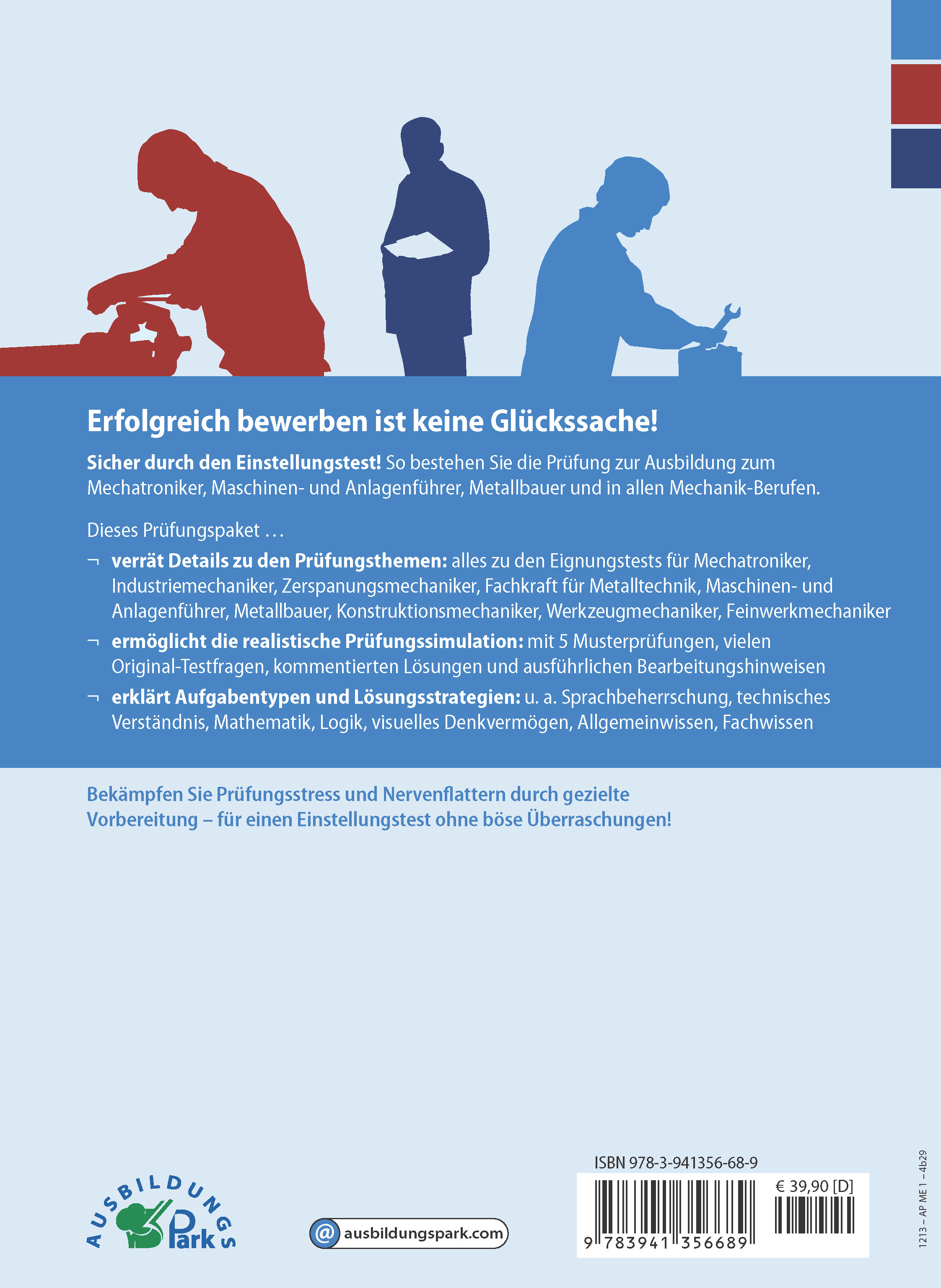 - verrät Details zu den Prüfungsthemen: alles zu den Eignungstests für Mechatroniker, Industriemechaniker, Zerspanungsmechaniker, Teilezurichter, Maschinen- und Anlagenführer, Metallbauer, Konstruktionsmechaniker, Werkzeugmechaniker, Feinwerkmechaniker